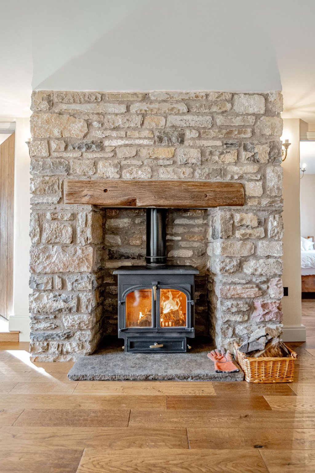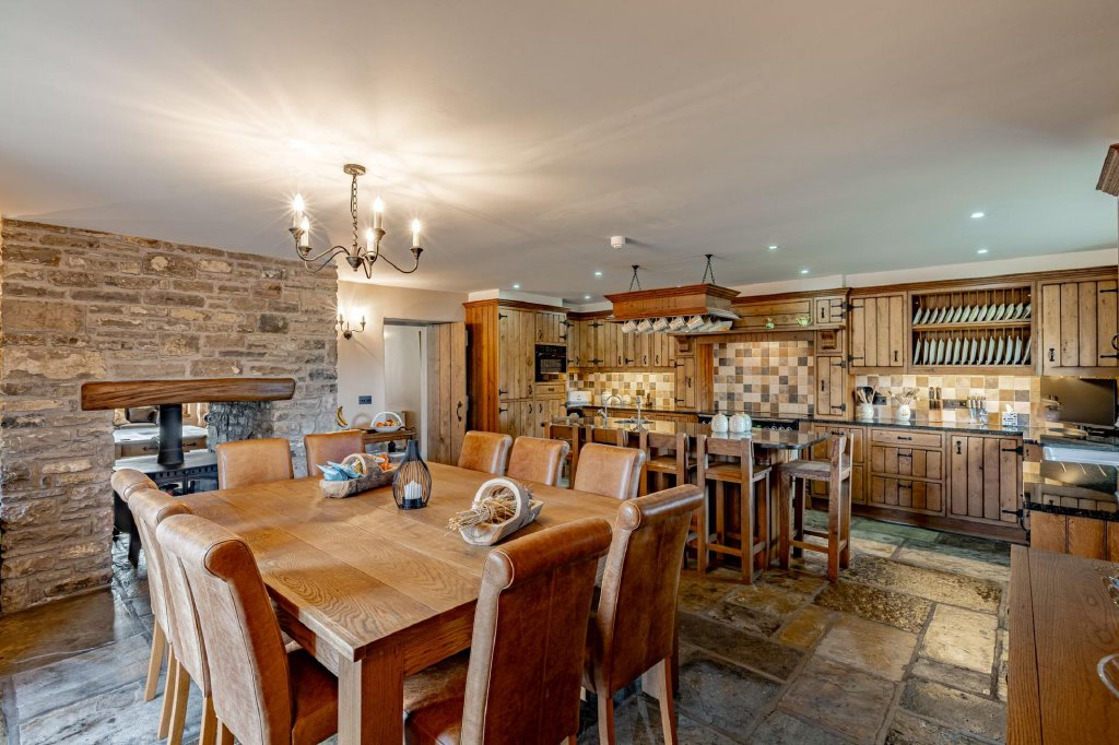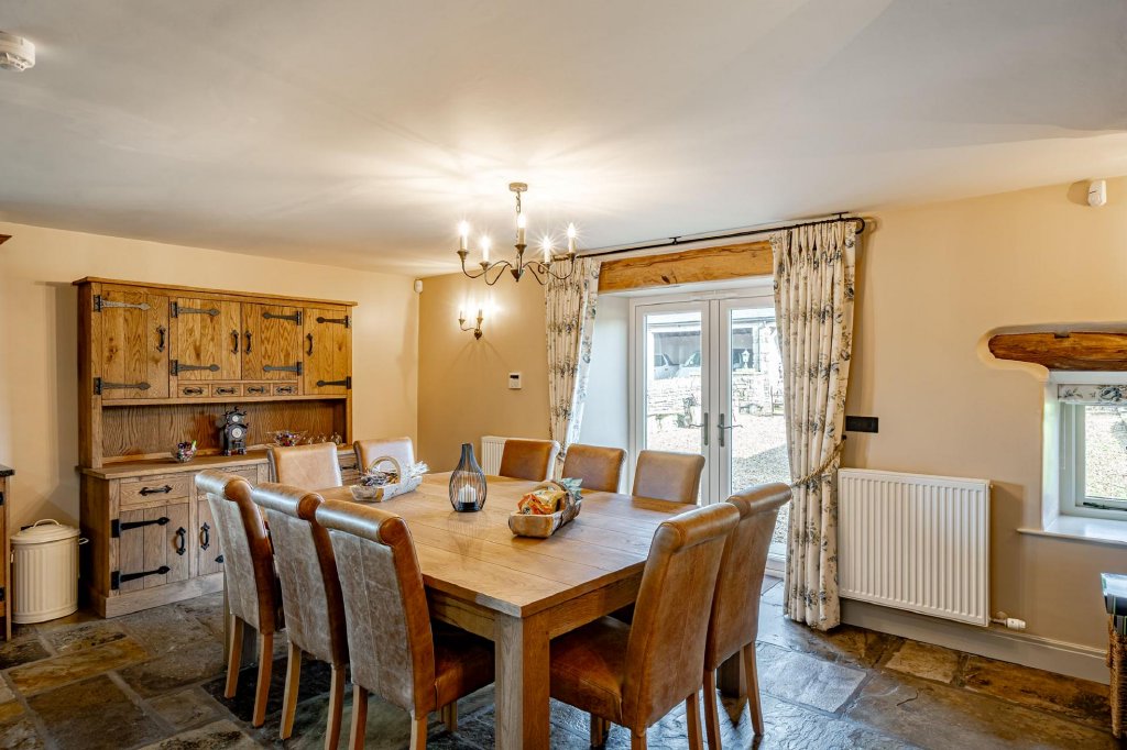 The kitchen flows naturally into a generous dining area where friends and family can gather around the table, with French doors opening directly onto the outdoor terrace for alfresco dining during the summer months. A striking double-sided log burner set within a stone chimney breast anchors the room and provides warmth and atmosphere, while exposed beams and stone flooring reinforce the character and timeless quality of this country kitchen.