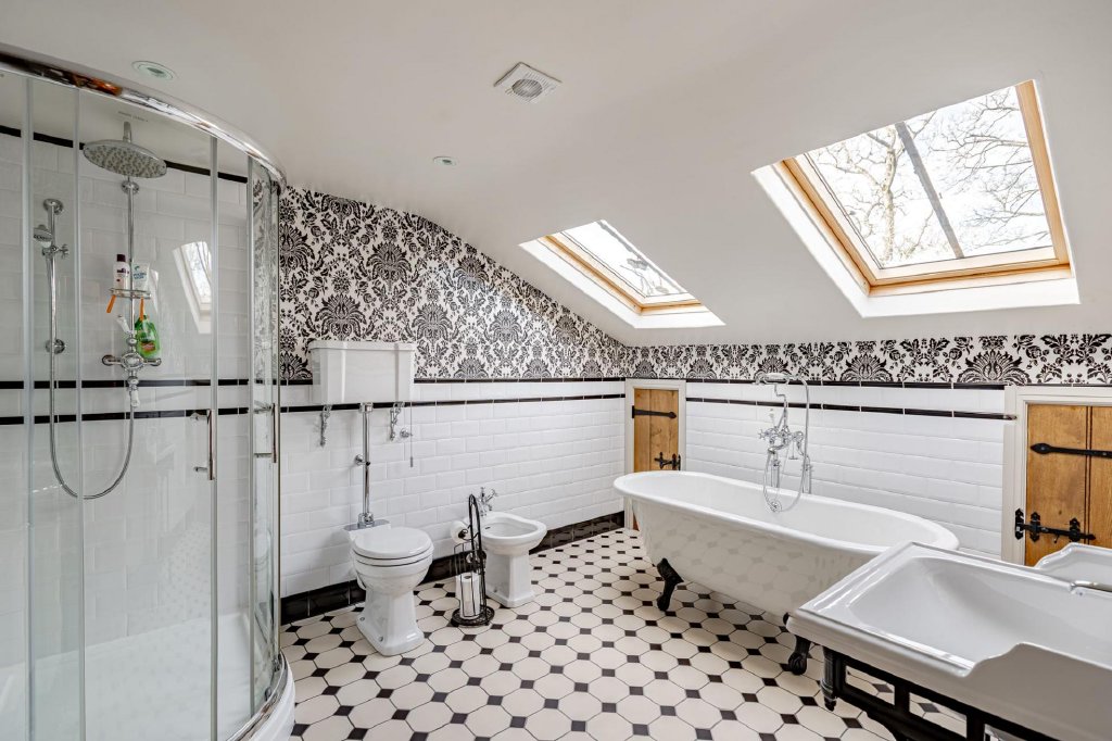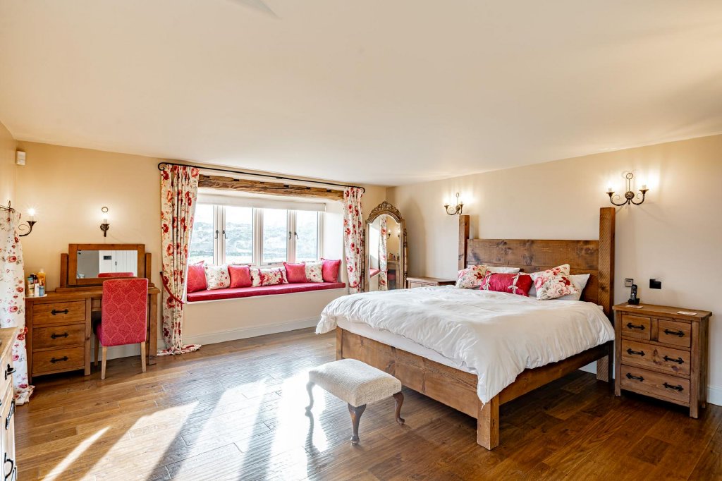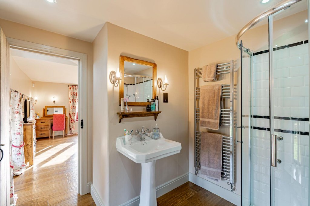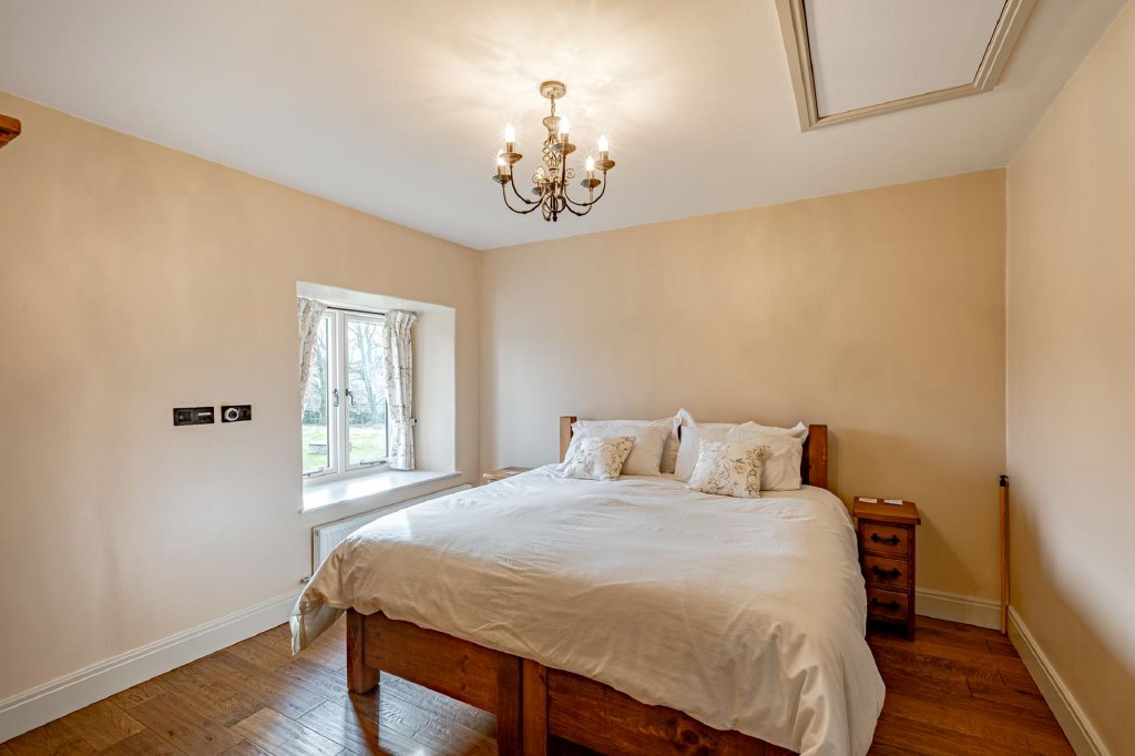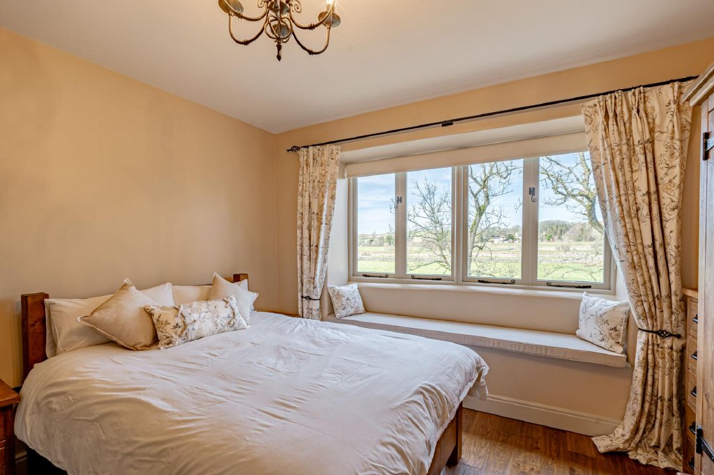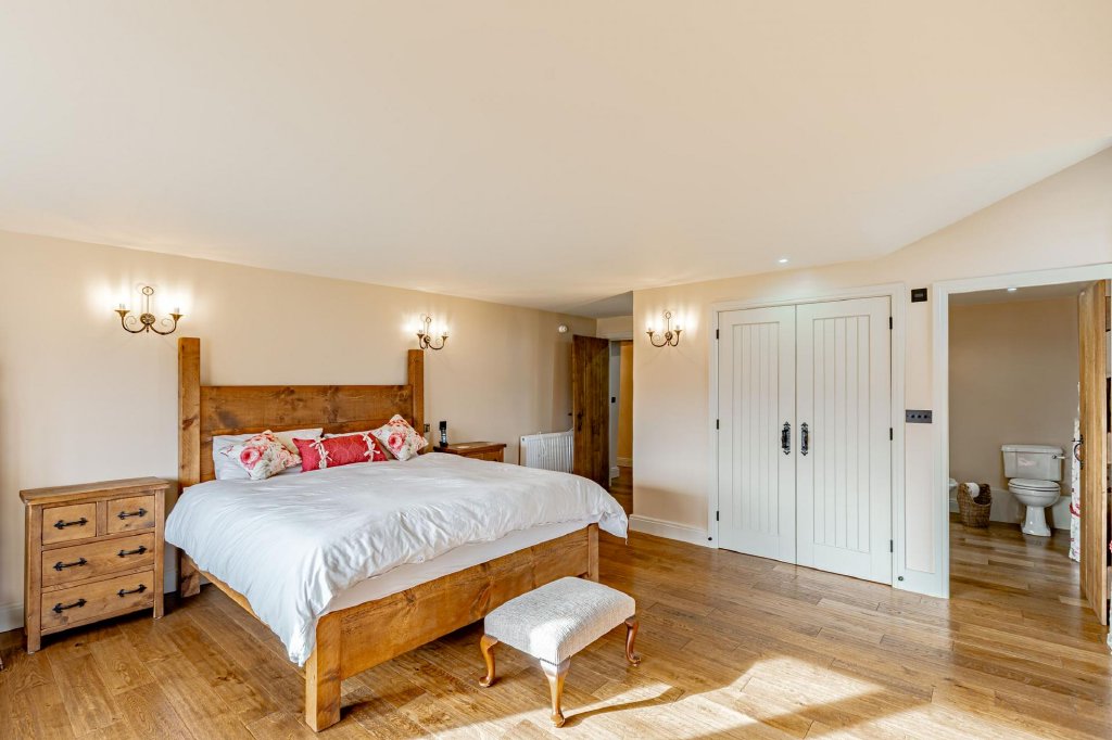 Upstairs, a spacious landing leads to the principal bedroom suite, a characterful and beautifully proportioned room enjoying spectacular views across the surrounding countryside. A charming window seat provides the perfect place to sit with a book while taking in the landscape beyond. The room benefits from two built-in wardrobes and a stylish ensuite shower room finished to a high standard. Additional accommodation on this floor includes a second double bedroom with ensuite, a further double bedroom, a single bedroom and a beautifully appointed family bathroom featuring a freestanding bath, large walk-in shower and useful storage tucked neatly within the eaves.