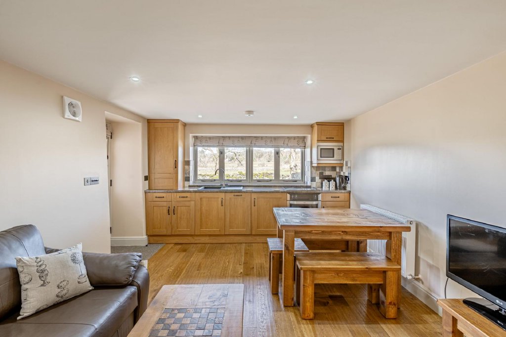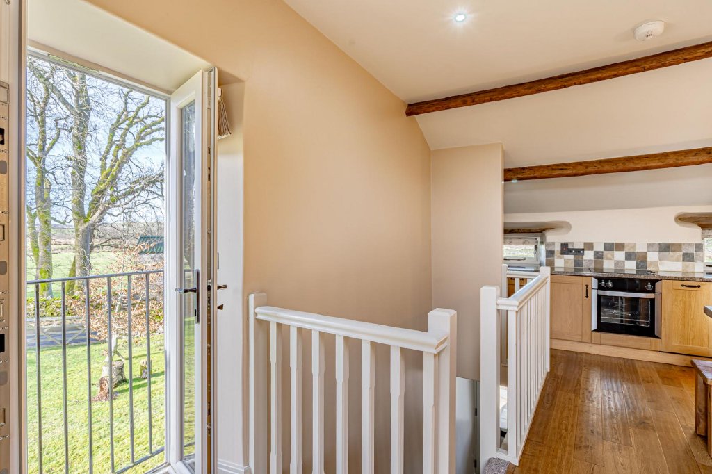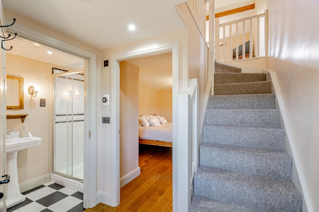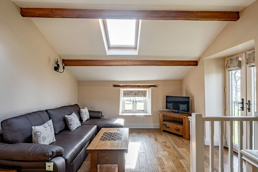 The first cottage is arranged entirely on one level and offers accessible accommodation including a double bedroom, a bathroom with large walk-in shower and an open-plan kitchen, dining and living area. The second cottage features a generous double bedroom and bathroom on the ground floor, while upstairs a striking open-plan living space with vaulted ceilings and exposed beams creates a wonderfully light and characterful room. A Juliet balcony provides lovely views across the surrounding countryside. A lockable interconnecting door between the cottages allows them to be joined together should larger groups wish to stay together.