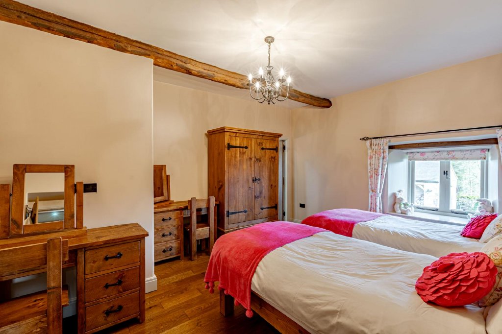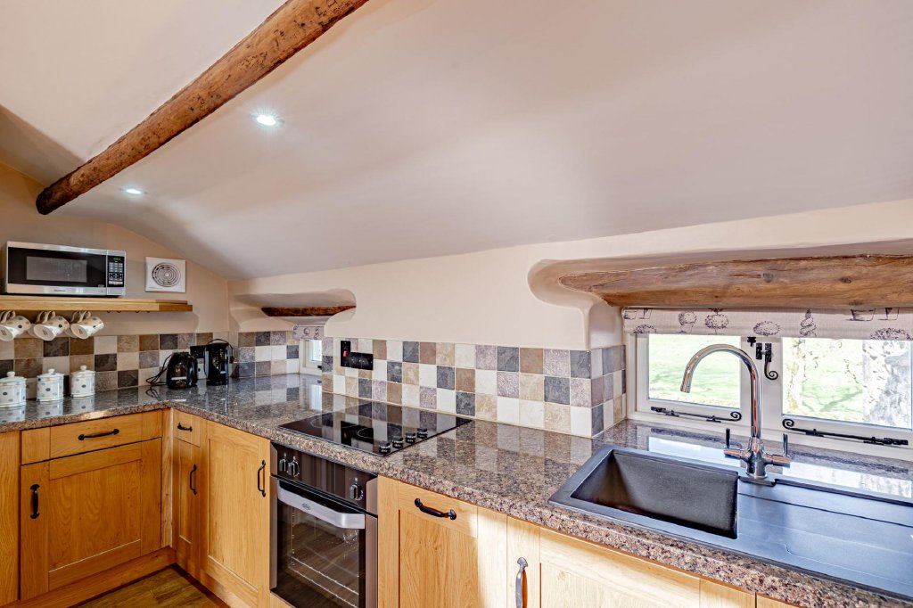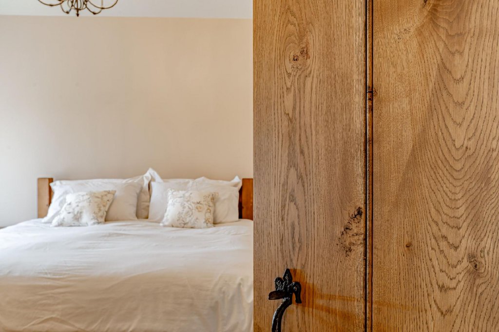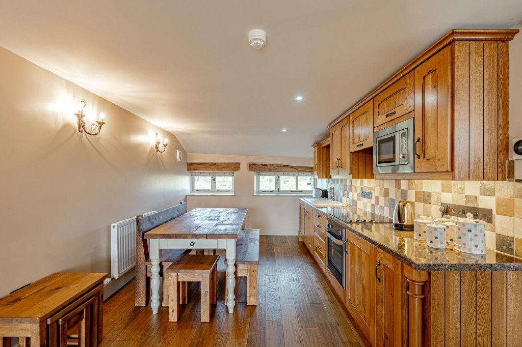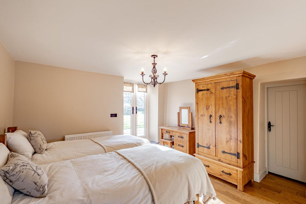 The first cottage is arranged entirely on one level and offers accessible accommodation including a double bedroom, a bathroom with large walk-in shower and an open-plan kitchen, dining and living area. The second cottage features a generous double bedroom and bathroom on the ground floor, while upstairs a striking open-plan living space with vaulted ceilings and exposed beams creates a wonderfully light and characterful room. A Juliet balcony provides lovely views across the surrounding countryside. A lockable interconnecting door between the cottages allows them to be joined together should larger groups wish to stay together.