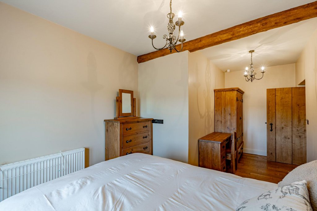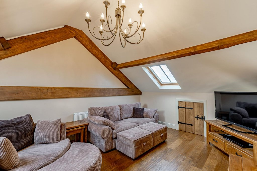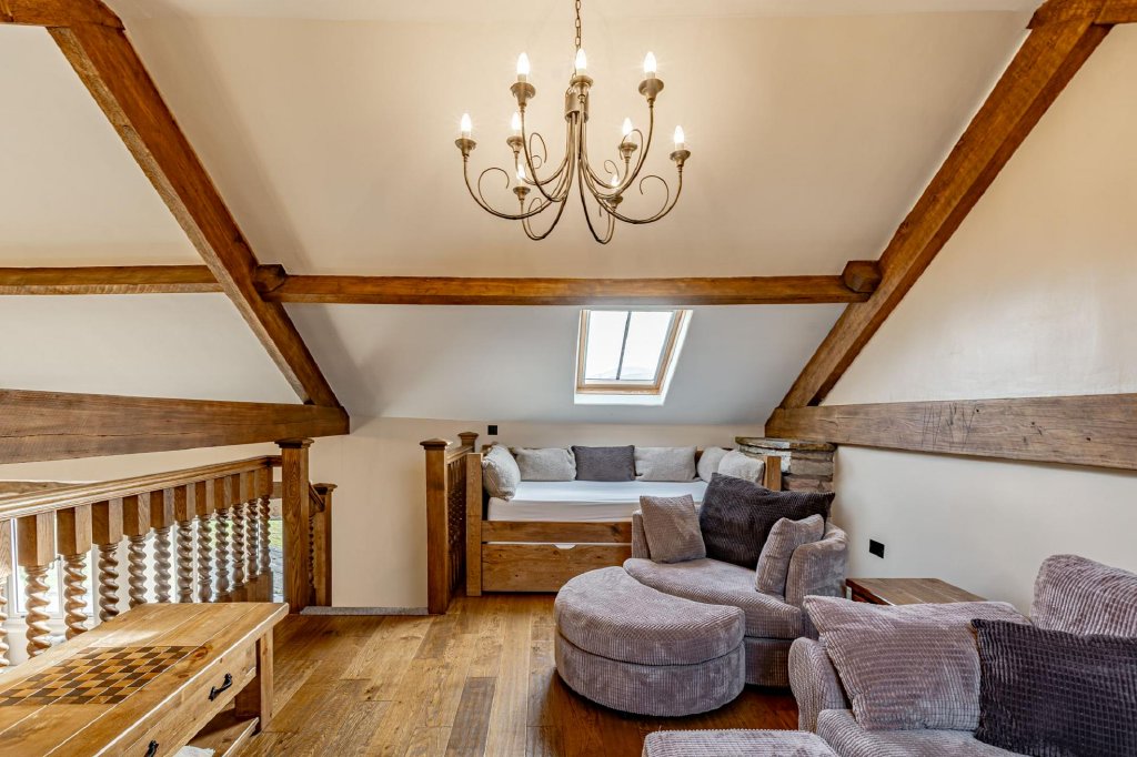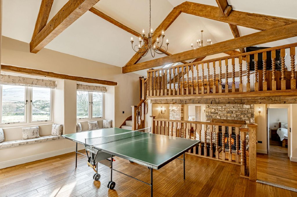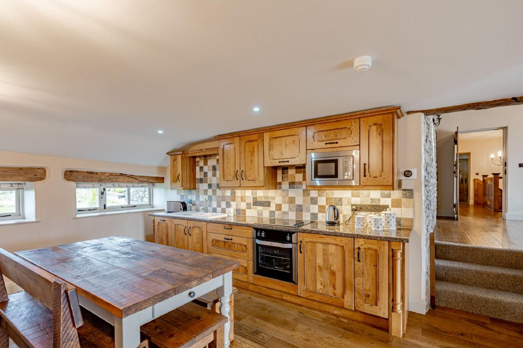 Connected to the main house is a superb two-bedroom annex, offering a truly impressive and flexible living space. The first room you enter is a dramatic double-height space with exposed beams and timber detailing, currently arranged as a games room with a full-size table tennis table. Above, a mezzanine level has been designed as a cinema or gaming area, while beneath it sits a comfortable lounge centred around a log burner set within a stone chimney breast with an oak lintel. A kitchen and dining space allow the annex to function entirely independently if required, while two generous double bedrooms, both with ensuite bathrooms, provide excellent accommodation for guests or extended family. French doors open onto a private patio area enclosed by traditional stone walls, offering a peaceful setting with magnificent countryside views. Importantly, the quality of finish throughout the annex matches that of the main house, with solid wood kitchen cabinetry and carefully considered detailing.