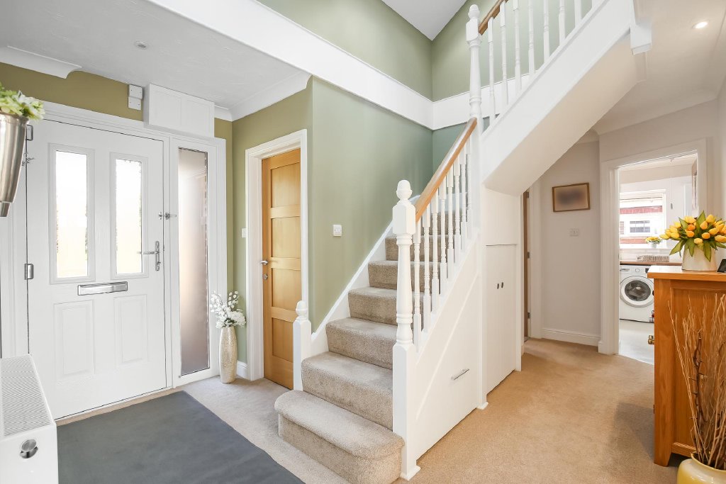 HALLWAY Balustrade staircase rising to first floor with galleried landing over with a maximum height of 14'8", doors to primary rooms, ceiling coving and spotlights, radiator, wired-in smoke alarm, double doored understairs storage cupboard with range of shelving and shoe drawer, controls for central heating.