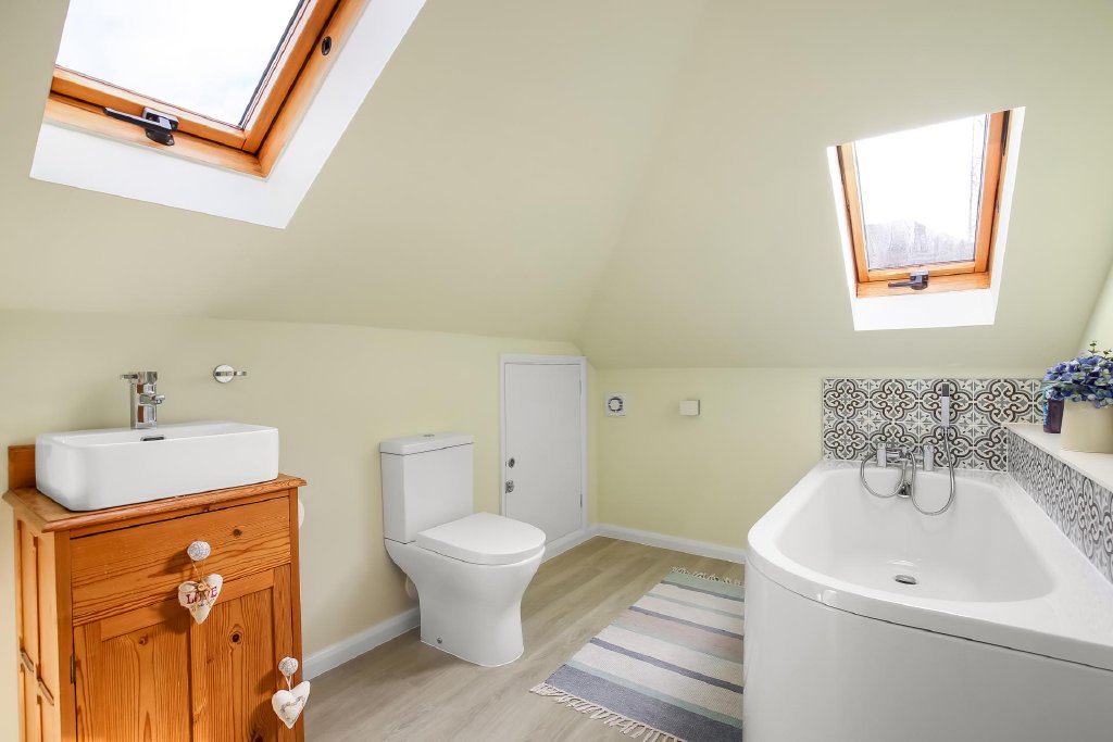 BATHROOM 10' 10" x 7' 4" (3.3m x 2.24m) Measurements taken from approximately 4' off floor level with slight eaves to front and side ceilings restricting headroom, access to loft space, skylight windows to front and side aspects, white suite comprising: low level w.c., rectangular wash hand basin with wooden cupboard and drawer under, radiator, panelled bath with mixer tap and shower attachment, tiled splashback and shelf over, vinyl wood effect flooring.