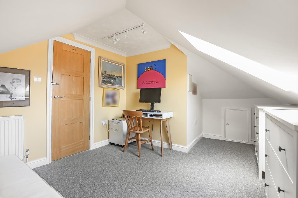 BEDROOM 2 14' 6" x 10' 9" maximum (4.42m x 3.28m) L shaped, measurements taken from approximately 3'5" off floor level with eaves to ceilings, access to loft storage space, skylight window to side aspect, radiator.