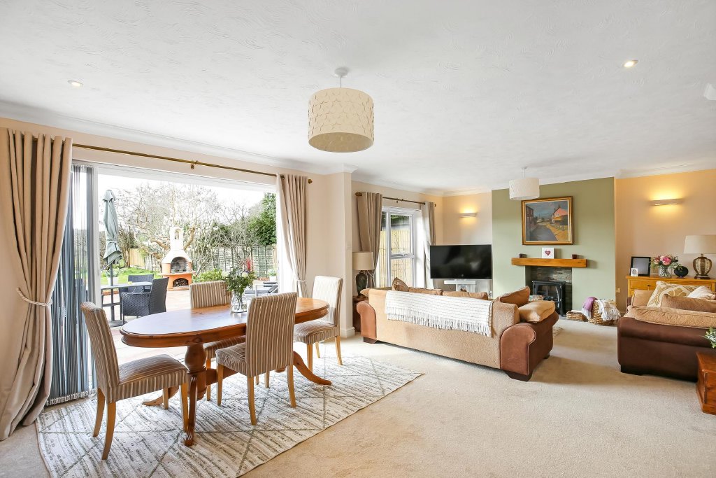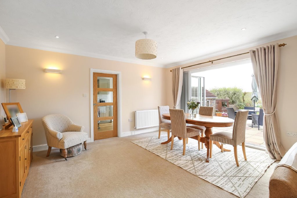 Dining area: Bi-folding doors leading to rear raised terrace with far reaching views over the garden towards farmland and woodland beyond, radiator, wall lights, textured ceiling with coving, door to: