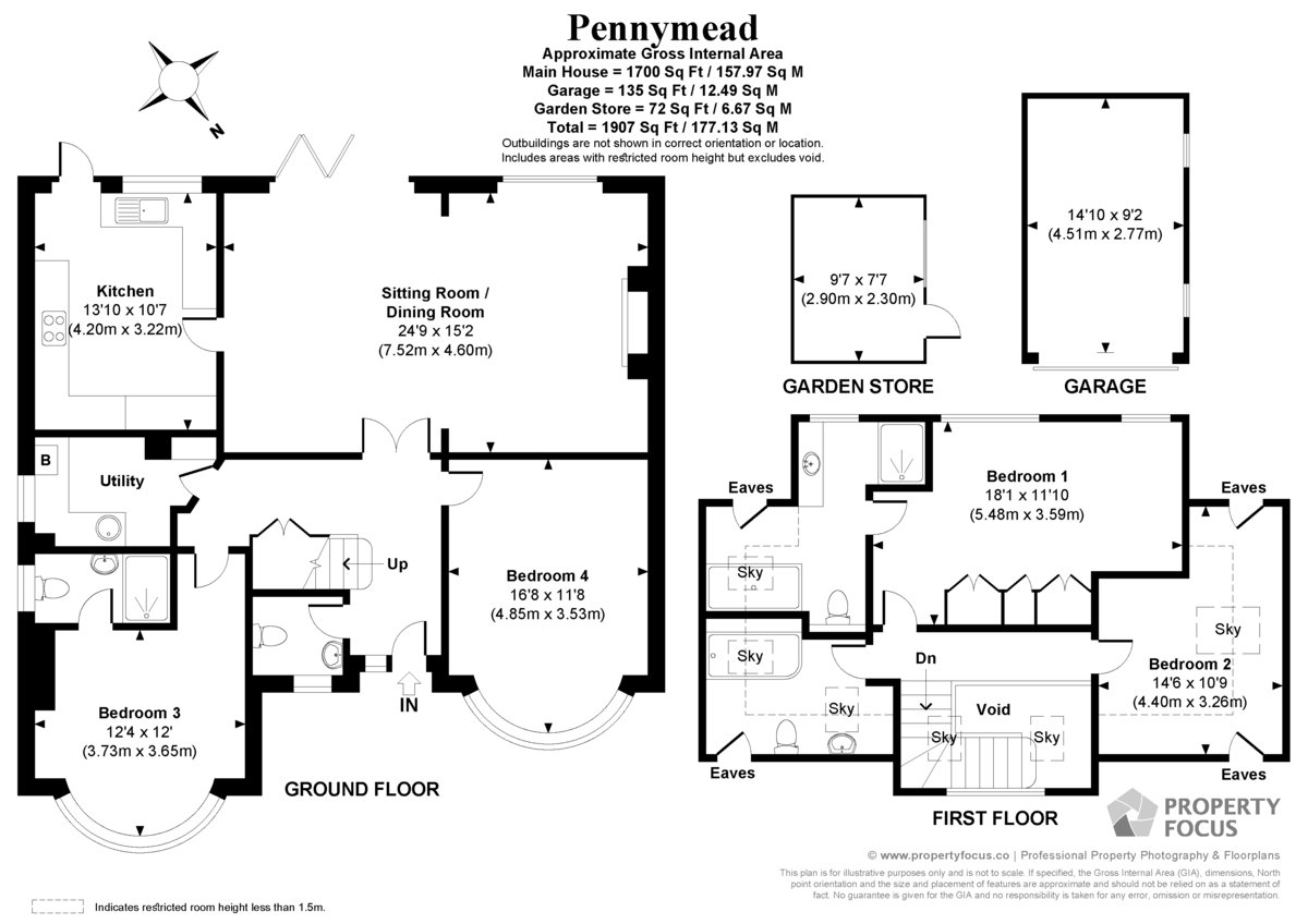 DETACHED GARAGE 14' 10" x 9' 2" (4.52m x 2.79m) Remote controlled roller door, pitched roof with high level storage, lighting and power points, double glazed windows to side aspect, external lighting.