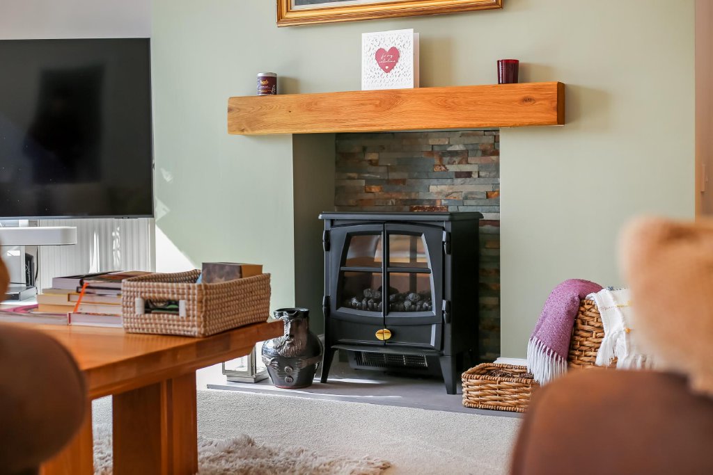 SITTING ROOM / DINING ROOM 24' 9" x 15' 2" (7.54m x 4.62m) Twin glazed doors leading to hallway, fireplace with stone surrounds and hearth, radiator, full height double glazed window to rear aspect overlooking garden, fields and woodland beyond, textured ceiling with coving.