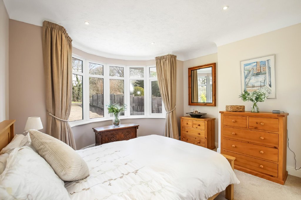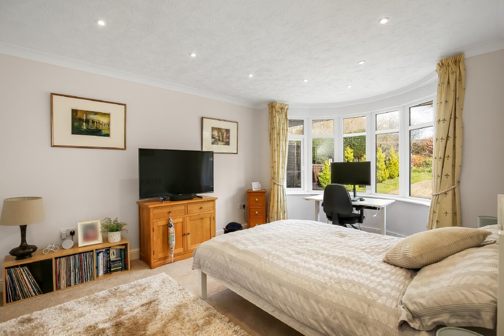 BEDROOM 3 12' 4" into bay window x 12' 0" (3.76m x 3.66m) Measurements do not include recessed area for door opening and radiator, infinity ceiling and spotlights, double glazed bow bay window to front aspect overlooking driveway and woodland beyond, door to:
