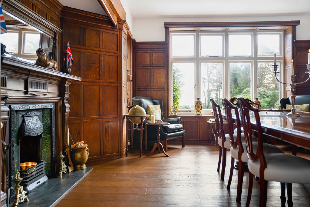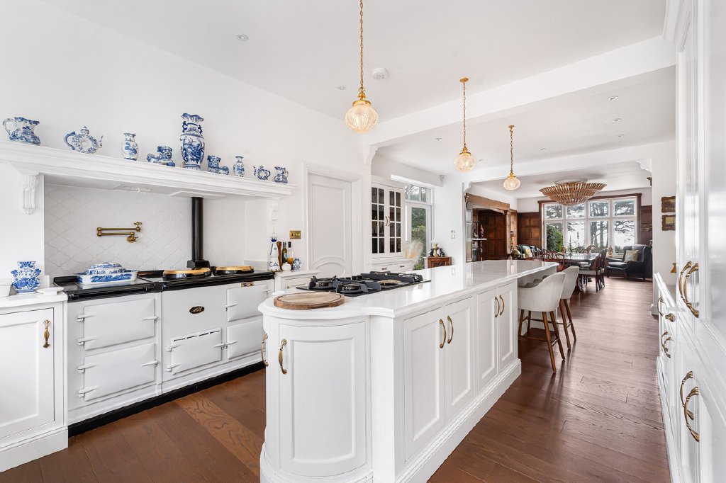 The heart of the home is the magnificent kitchen and dining room, where beautifully restored original wood panelling sits in perfect harmony with a contemporary kitchen installation. Solid quartz worktops, an AGA, and refined finishes create a space that is both highly functional and visually stunning, ideal for both everyday living and entertaining on a grand scale. Off the kitchen, a delightful walk-in pantry provides additional storage and practicality, seamlessly blending convenience with style.