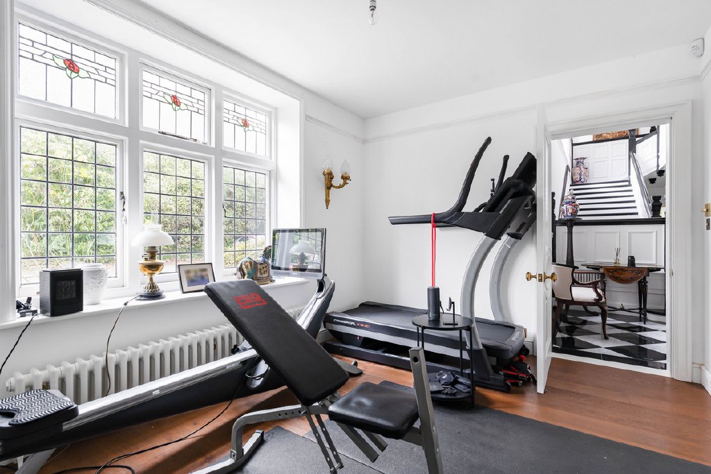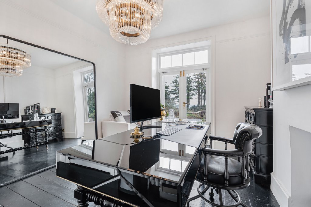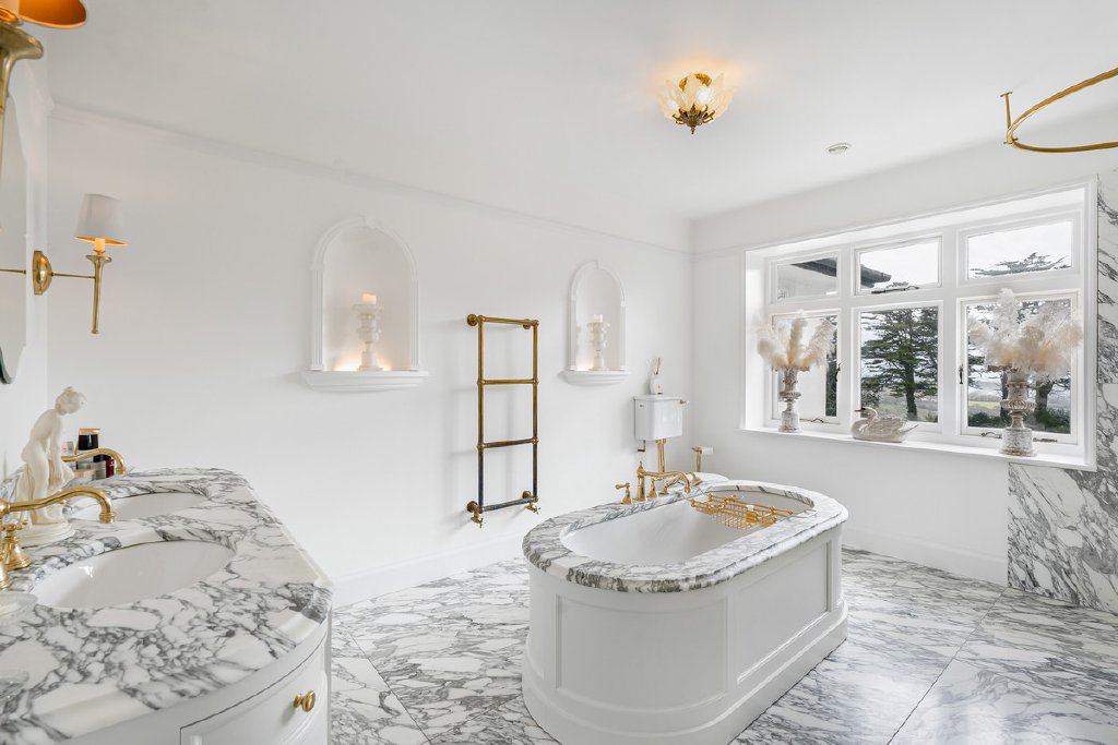 The living and sitting rooms are generous, light-filled and rich in character, featuring classic 1930s bay windows, restored flooring and open fireplaces that bring warmth and charm to each space. The remainder of the ground floor accommodation includes a well-equipped gym, a utility room, and a study/office, providing versatile spaces for both work and leisure. Large windows frame glorious views across the surrounding countryside and towards the sea, ensuring a constant connection to the property’s idyllic setting.
