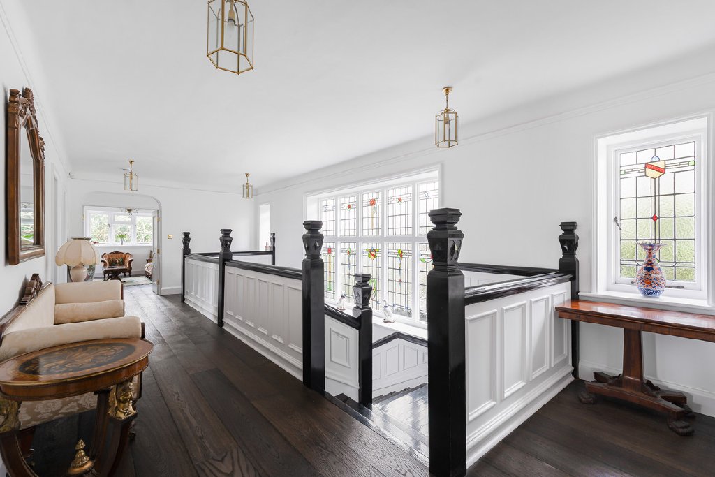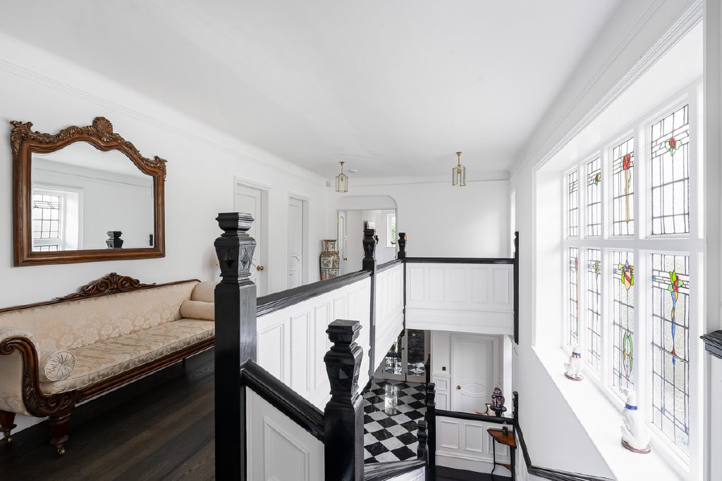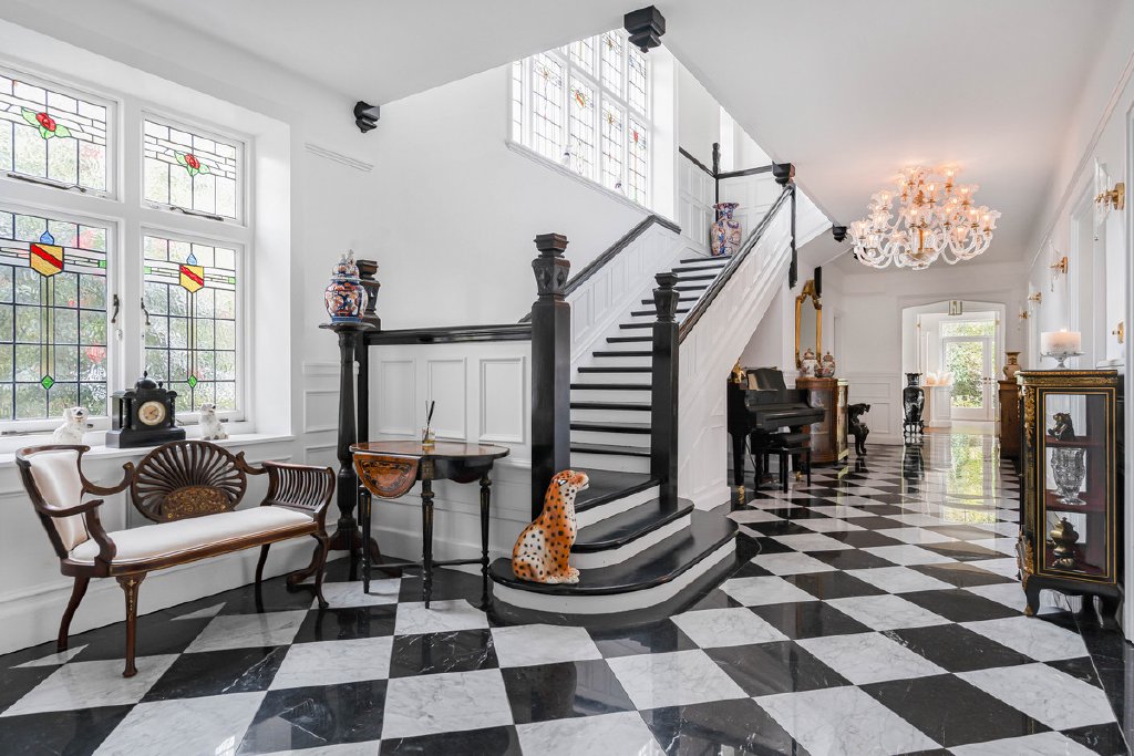The approach to the house immediately sets the tone, revealing a home of quiet grandeur and timeless appeal. The spacious entrance hall is a statement in itself, showcasing striking chequered stone flooring, a sweeping open staircase and elegant stained-glass detailing, all combining to create a memorable first impression.