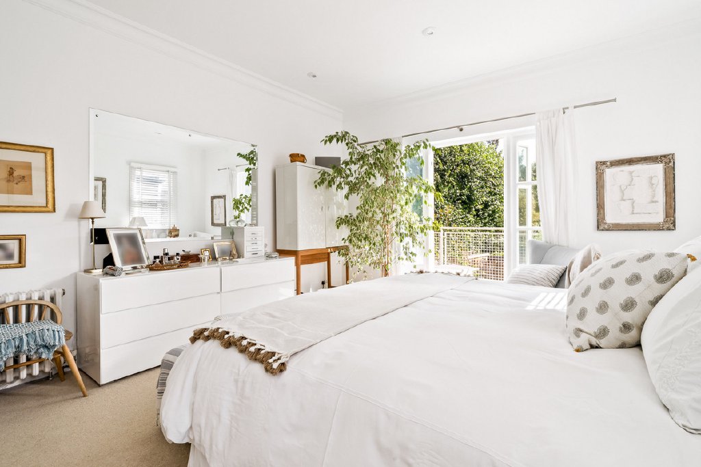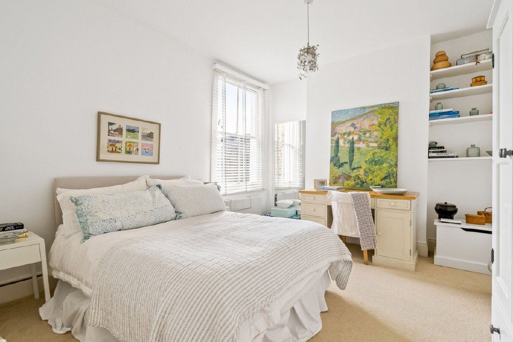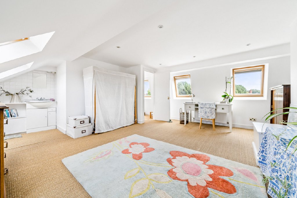 The principal bedroom claims the best view: built‑in wardrobes, a private balcony and that wide, open sweep of the gardens in front of you. Two more doubles on this floor keep things civilised no box rooms, no sulking about who got the small one. Plus a modern family bathroom that can actually cope with a morning rush. Up under the eaves, the top‑floor bedroom spreads out into a generous, loft‑style space with masses of storage; it’s part teenager’s den, part guest suite, part “I work from home now” studio. A downstairs shower room and extra storage on every level keep day‑to‑day life from descending into chaos.