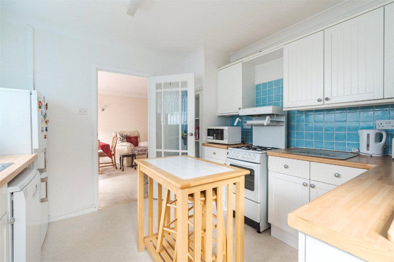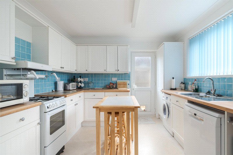 An enclosed entrance porch leads to a spacious reception hall with under stairs cupboard and built-in cupboard. The lounge/dining room has a fitted gas fire and a casement door to the rear garden. There is a modern kitchen with units, worktops and door to outside. The appliances are available by separate negotiation.