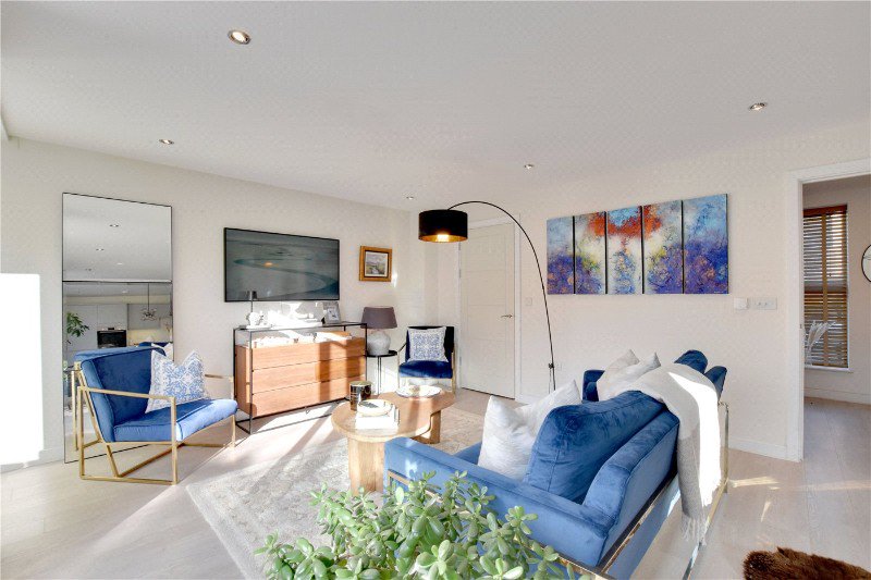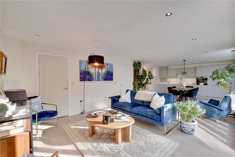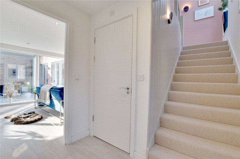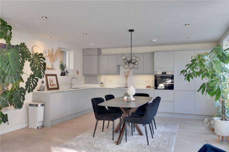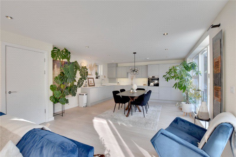 The ground floor is the real showpiece, a beautifully open and sociable arrangement with the living space intelligently wrapped around the courtyard, so natural light pours in throughout the day and the garden becomes a genuine extension of the home. The kitchen/dining room is a brilliant size for everyday life and entertaining, with sleek contemporary cabinetry, excellent storage and generous worktop space, while the adjoining reception space offers a relaxed place to unwind, with wide glazing connecting straight out to the courtyard.