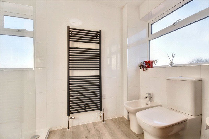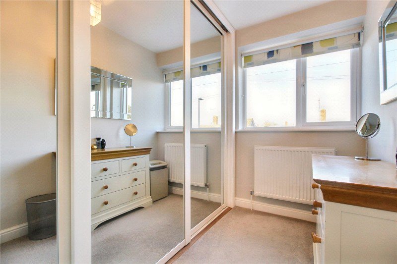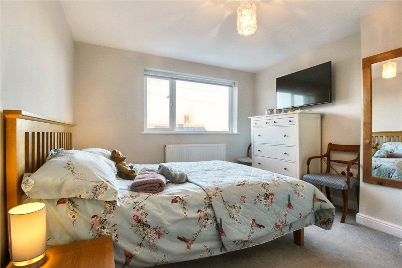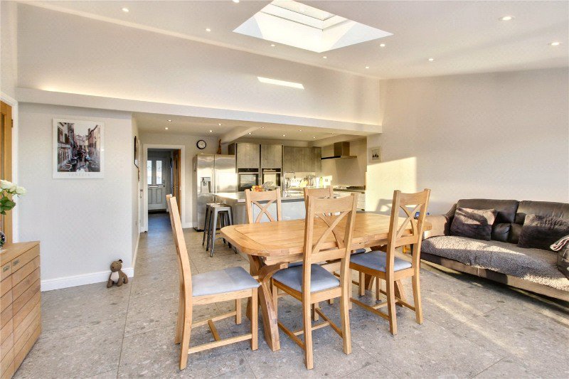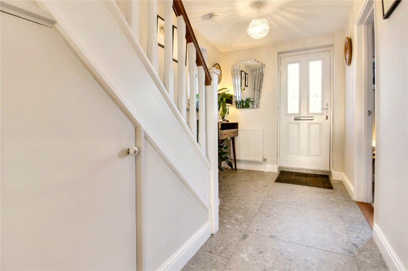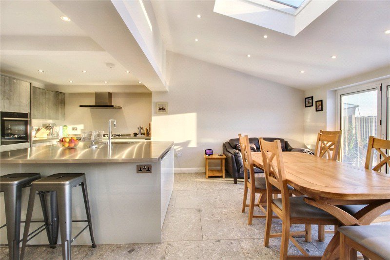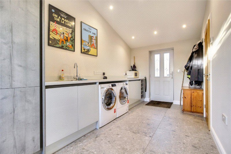 A gabled ceiling with Velux windows draws your eye up. A well-appointed, contemporary, gloss fronted kitchen is perfect for keen cooks. To the side is the utility/boot room which has the ground floor cloakroom set to the side. Upstairs, there are three bedrooms which are all generously sized and great for older children. A double aspect bathroom fitted with a matched white suite completes the accommodation.