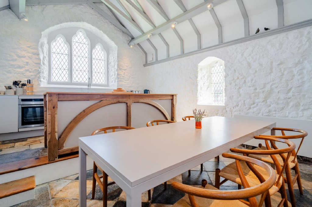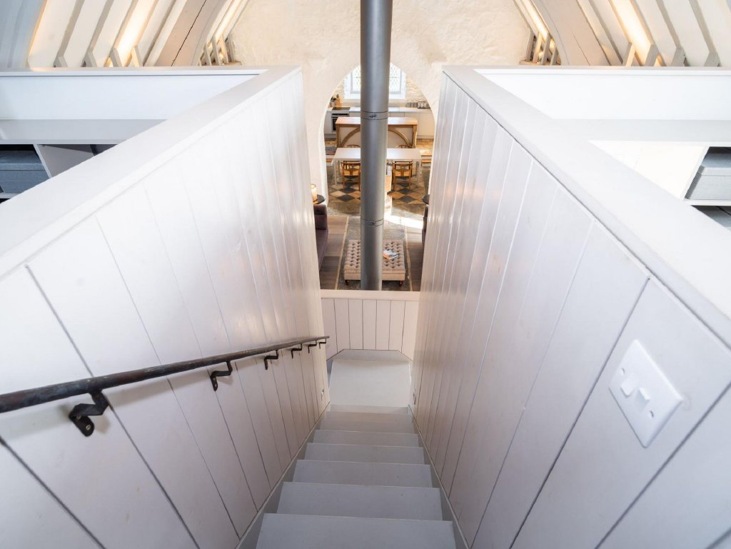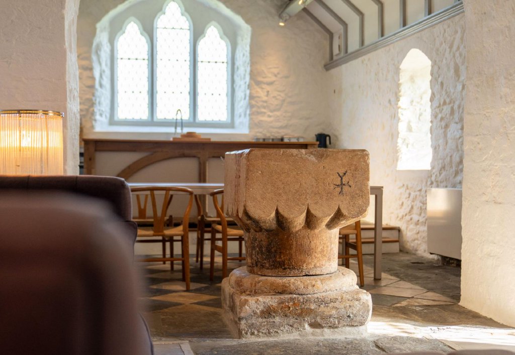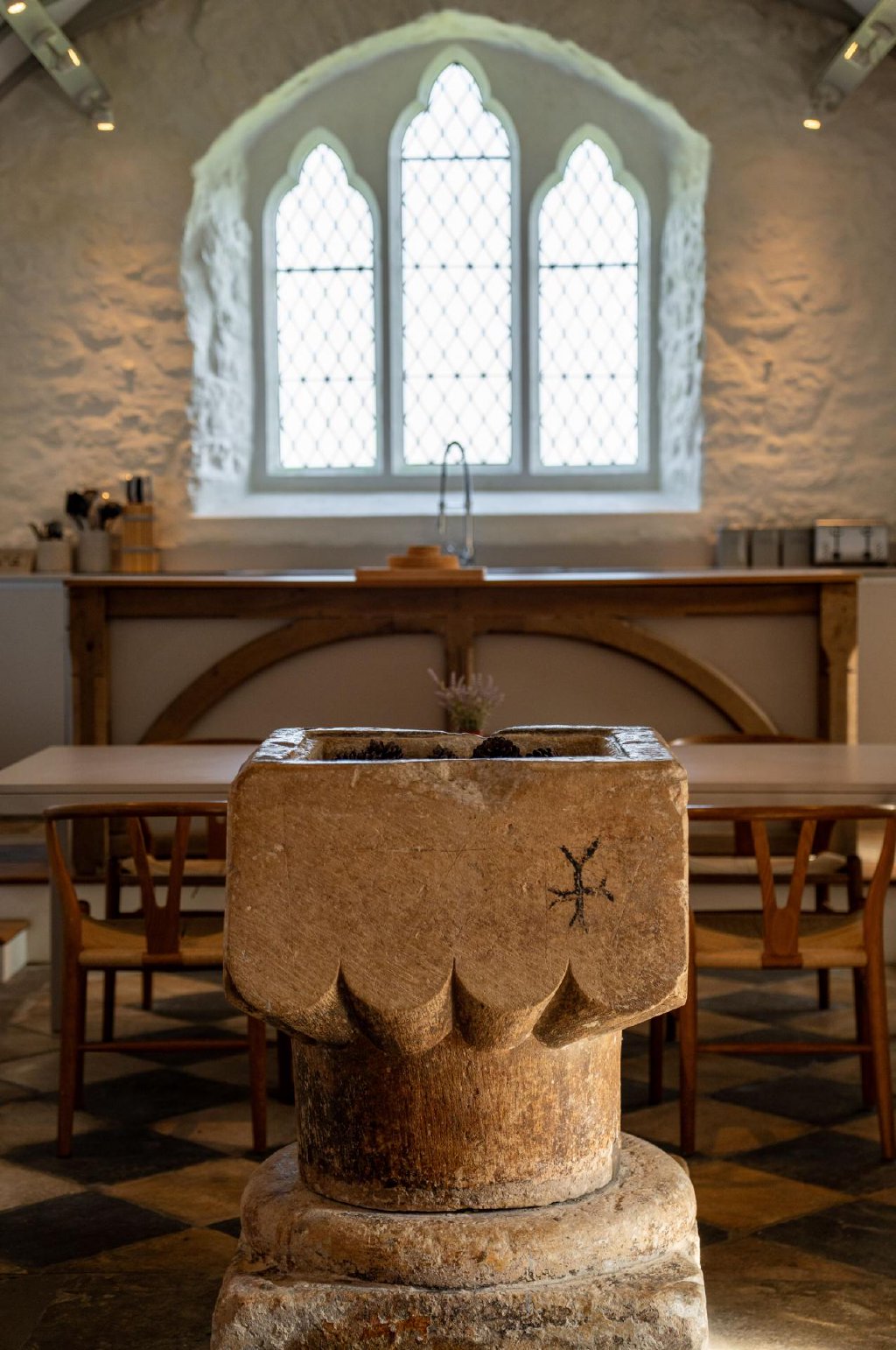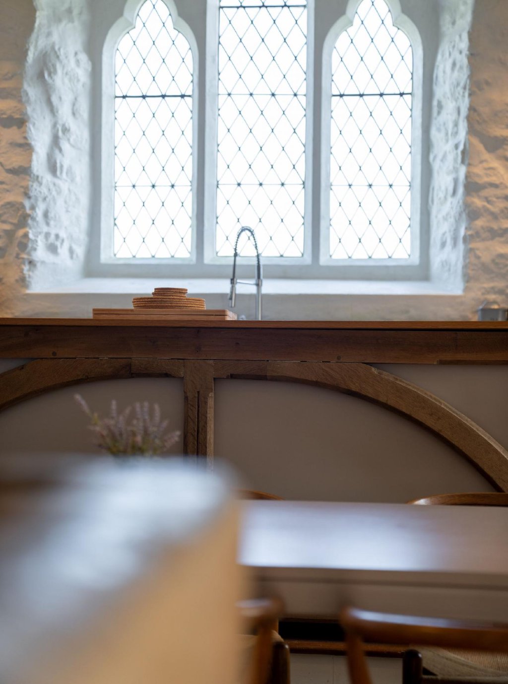 The open-plan kitchen and dining area is separated from the main living space by an early Gothic archway, beneath which stands a beautifully preserved Romanesque oolite font, now serving as a distinctive centrepiece. The bespoke kitchen has been thoughtfully designed to incorporate the church’s original oak altar as a kitchen worktop, blending historic craftsmanship with clean, modern lines and high-quality finishes.