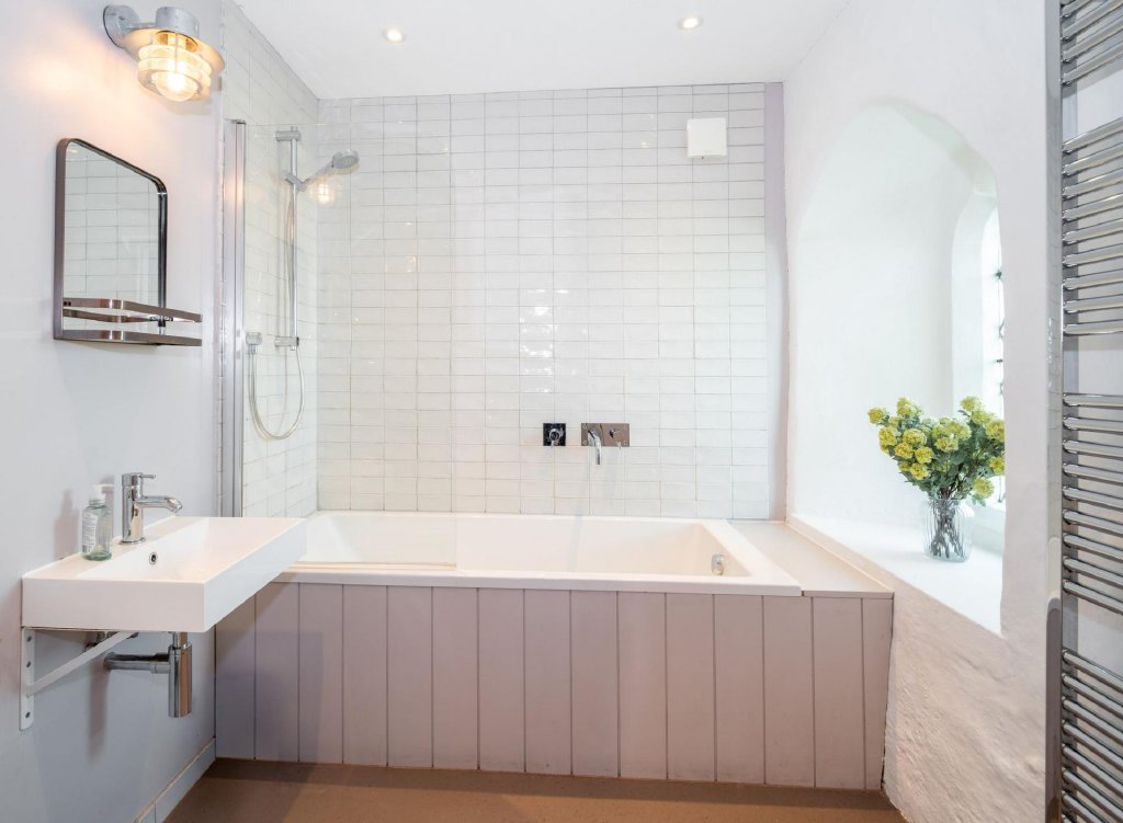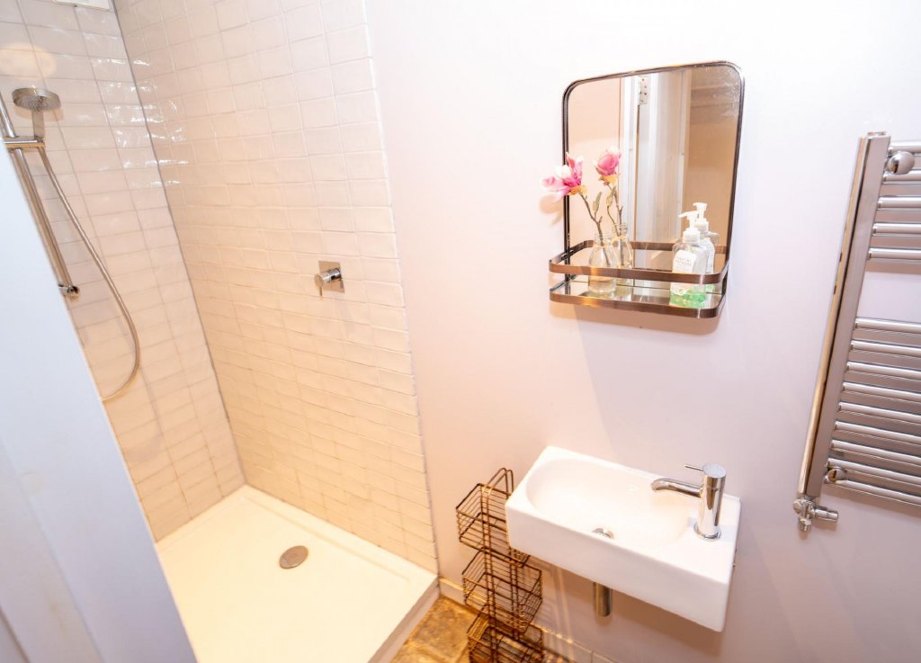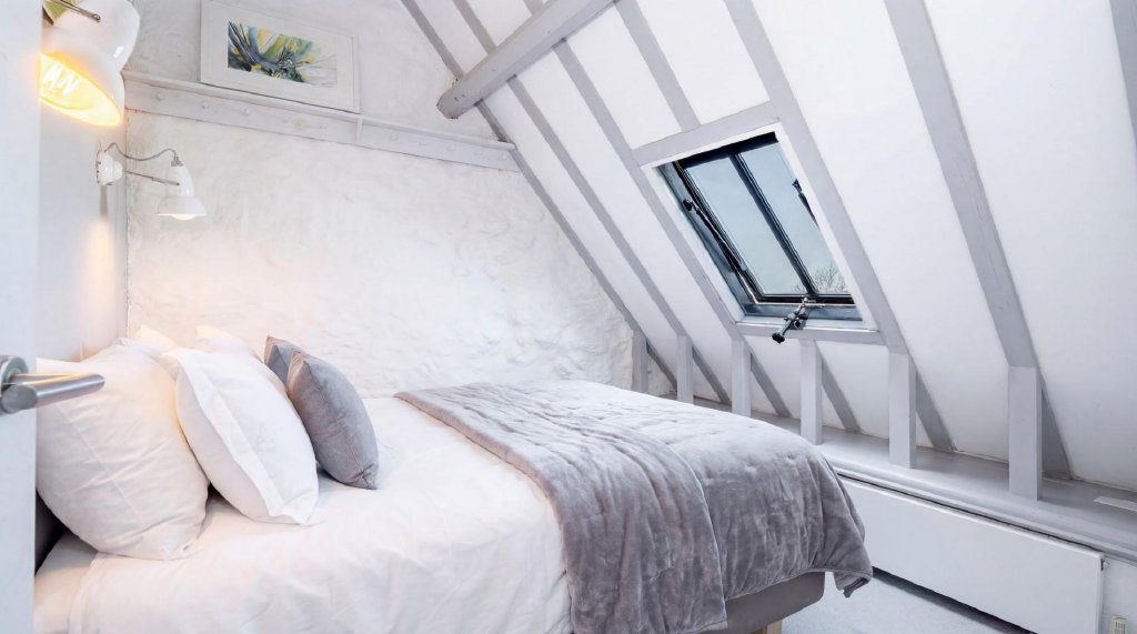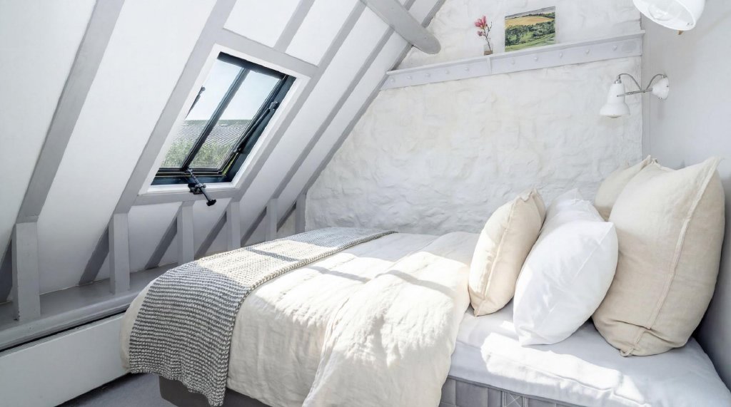 A mezzanine gallery overlooks the principal living areas and provides flexible space ideal for home working, additional seating, or occasional guest use. Beyond, two charming bedrooms are set beneath the eaves, each enjoying elevated views across the surrounding countryside through conservation rooflights. The accommodation is served by two stylish bathrooms, including a boutique-style bathroom with a bath positioned beneath a medieval window.