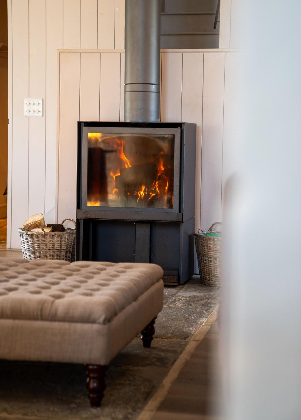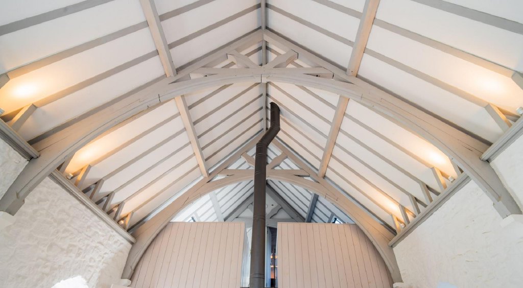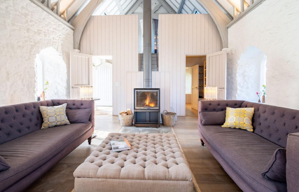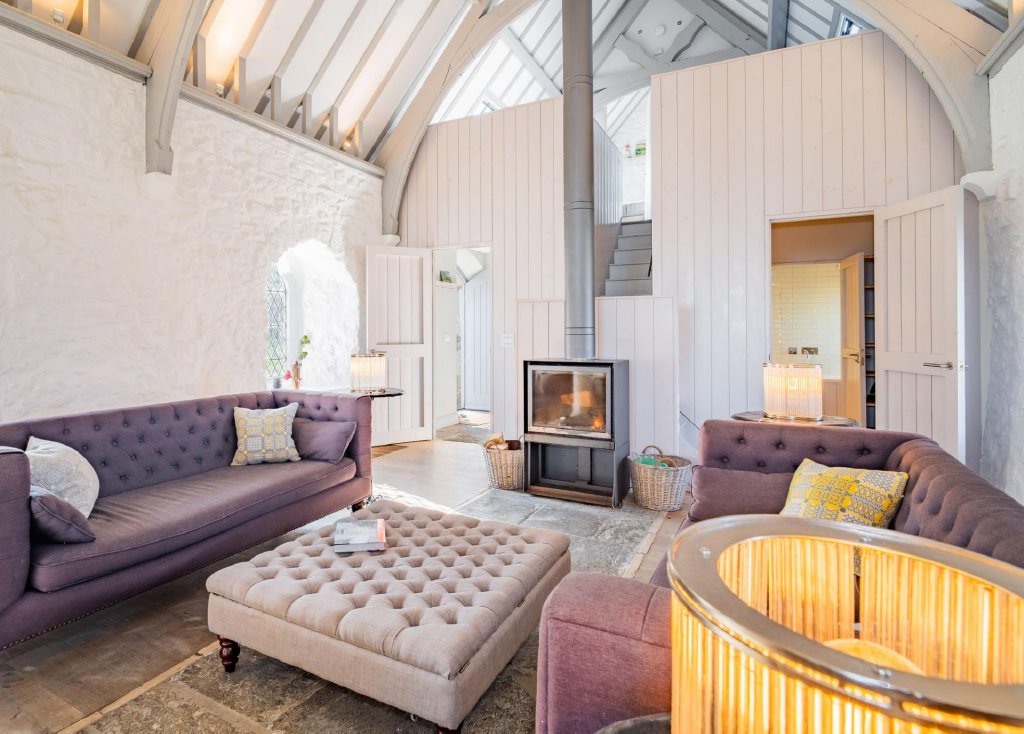 The interior is arranged around a dramatic double-height living space beneath an impressive 19th-century Arts and Crafts roof. At its heart sits a sculptural Stûv wood-burning stove, providing both visual impact and warmth, while arched stone mullion windows flood the space with natural light and frame picturesque rural views.