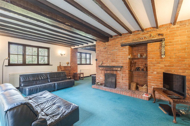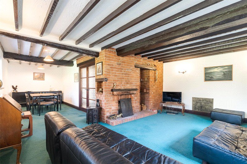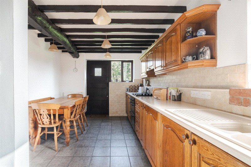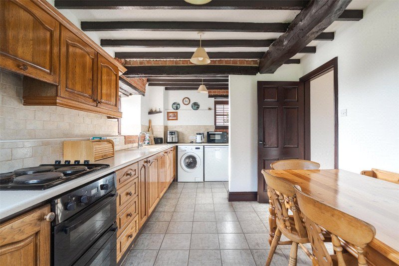 A stable door leads to a reception hall (with a beamed ceiling, a stone tiled floor and a large under stairs cupboard), off which is a ground floor cloakroom. Glazed double doors give access to a spacious, dual aspect sitting/dining room with a beamed ceiling, glazed doors to outside, and a feature brick wall with open fire and shelved recesses.