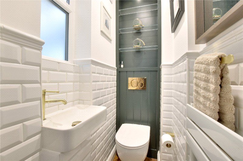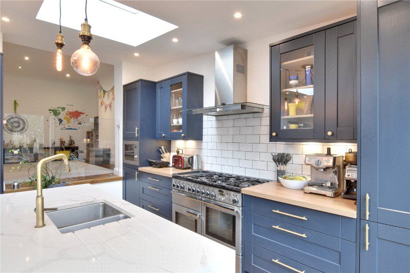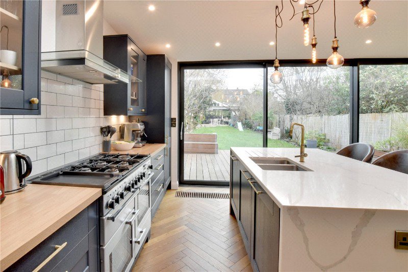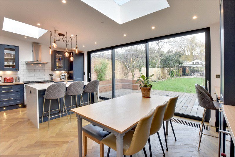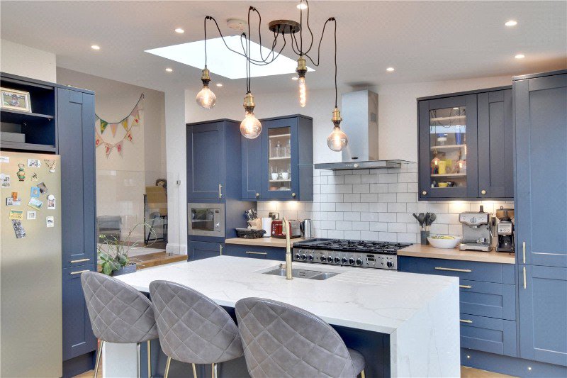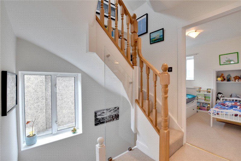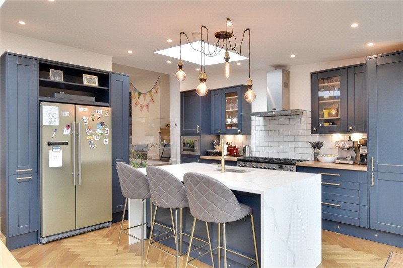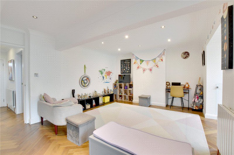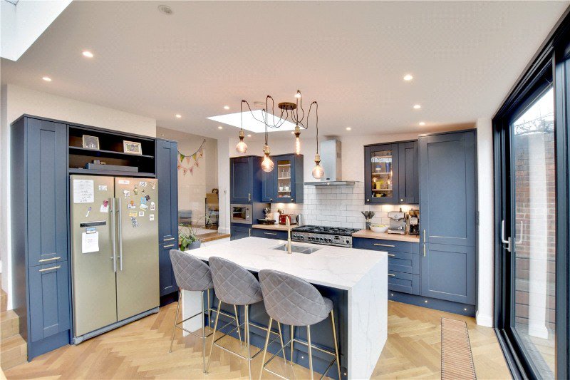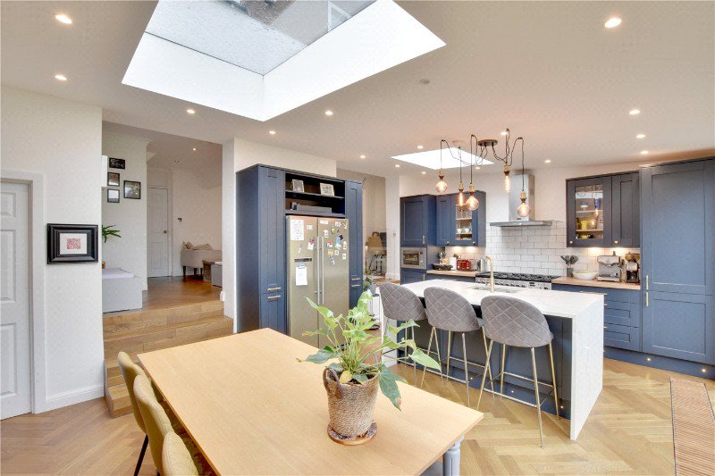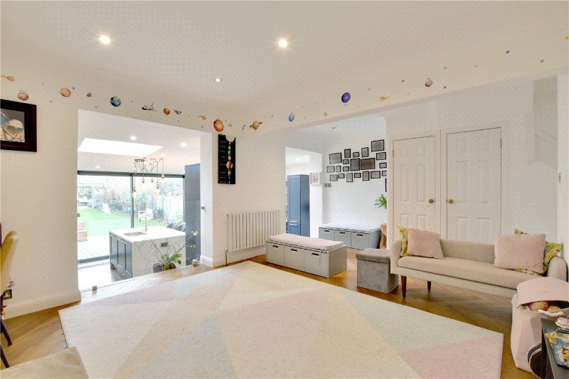 The ground floor is arranged brilliantly for family life, beginning with a formal reception room to the front of the house. To the rear is a large second reception room, ideal as a playroom or family room, with steps leading down into the impressive kitchen/dining room. A glazed balustrade creates an open connection back to the playroom, making it perfect for keeping an eye on the children while cooking or entertaining. The kitchen/diner itself is finished to a high standard with generous storage, expansive worktops and a large island with seating, while rooflights and wide rear glazing flood the space with natural light and provide a seamless link to the garden. Further benefits include a separate utility room with space for a washing machine and tumble dryer, a useful lean-to/side area, and a downstairs WC.