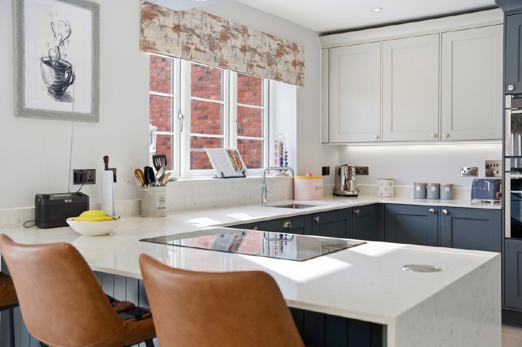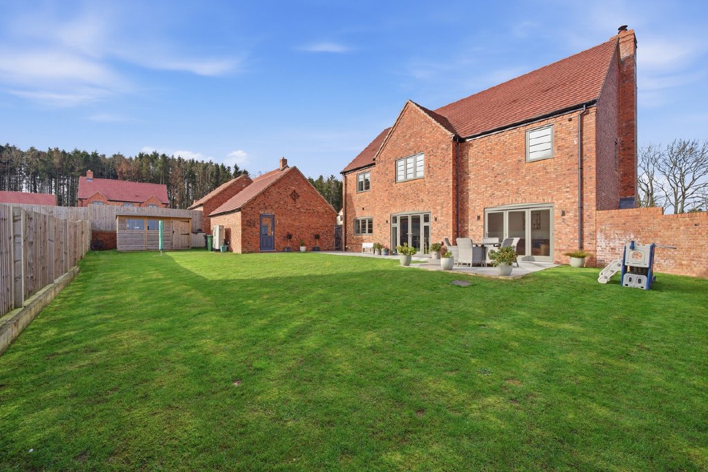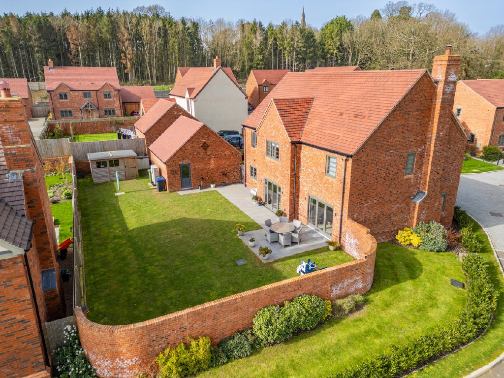 The architectural style is inspired by the region’s heritage, incorporating features such as half-timbered gables, tumbled brick façades, tall chimneys, and overhanging eaves. At the southern end of the development, two striking homes draw influence from the neo-Georgian era, built in red engineered brick with stone porticos, large sash windows, and steep slate roofs that suggest a quiet grandeur.