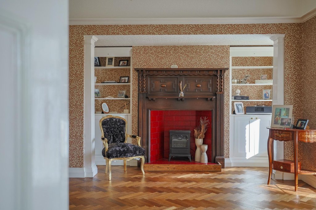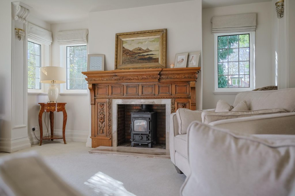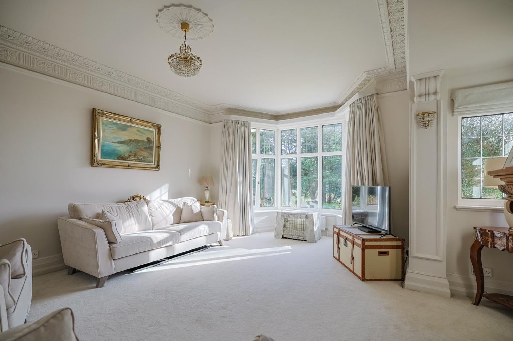 A generously proportioned sitting room, accessible from both the entrance hallway and reception hall, offers a large side bay window overlooking the garden. Carpeted floors, high ceilings with intricate detailing, and a feature fireplace with marble surround and hearth.