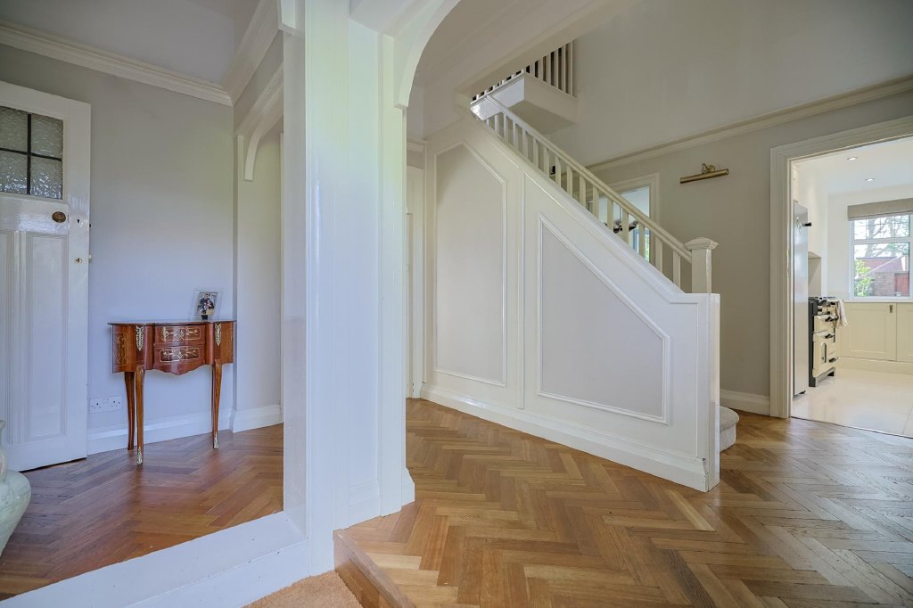 Through a stunning feature front door adorned with stained glass, you enter a super welcoming hallway, laid with herringbone flooring and a circular feature window. High ceilings with elegant coving and plate rail enhance the spacious feel, while a carpeted stairway leads to the first floor. The entrance provides access to the kitchen/dining/family room, sitting room, reception hall, and inner hallway, with ample discreet space for coats and shoes. Here you also have an integrated alarm system which adds peace of mind.