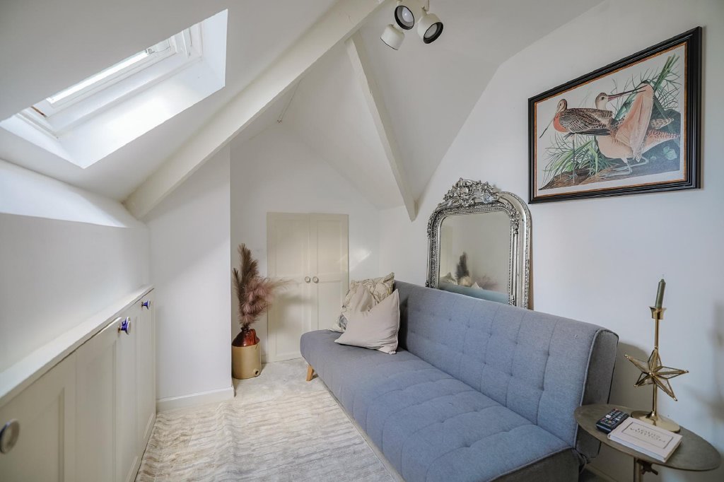 A versatile room ideal as a single bedroom, study, or snug, with carpeting, vaulted ceiling, Velux window, and plentiful storage.
