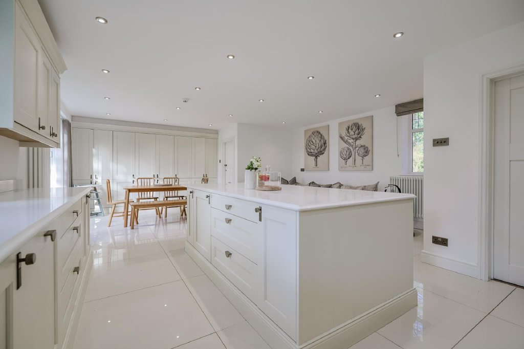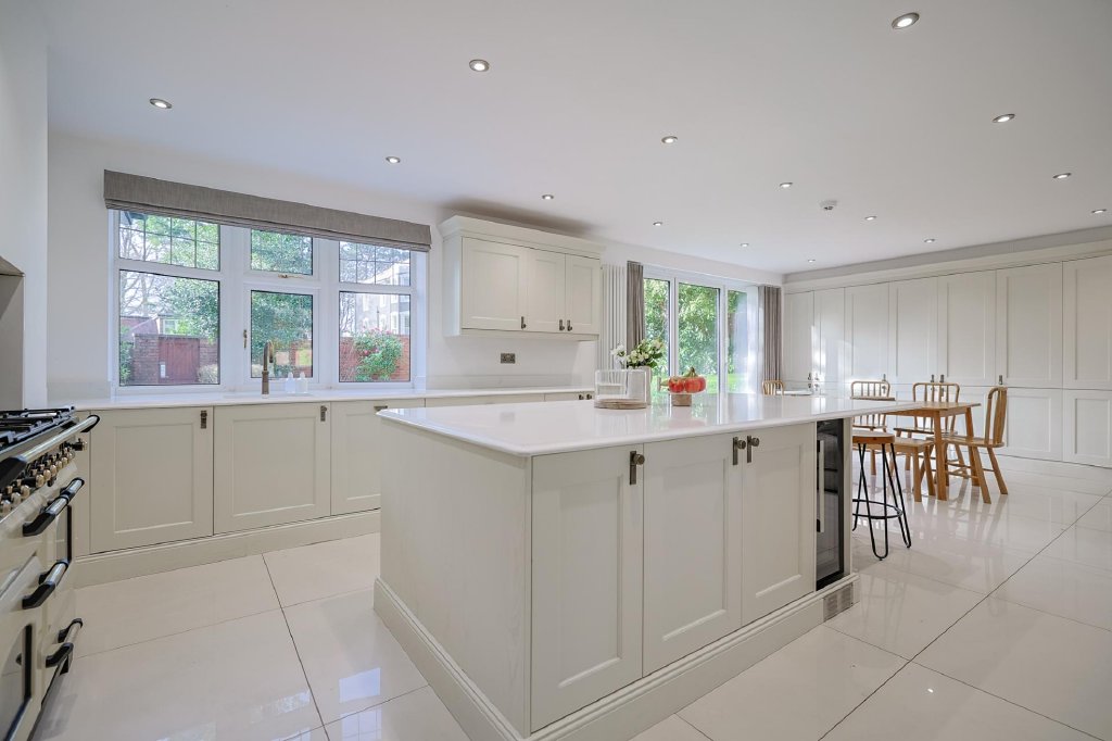 At the heart of the home, the stunning kitchen/dining/family room is bright and airy, with dual-aspect windows and bi-fold doors that seamlessly connect the interior with the garden. Tiled flooring and spotlighting enhance the contemporary feel, while a range of wall and base units topped with white quartz worktops provide ample storage. Integrated appliances include a sunken sink with swan tap, NEFF dishwasher, double Rangemaster oven with 5-ring hob and hot plate, space for an American-style fridge/freezer, and a large island with breakfast bar and slimline wine cooler. A dining area and family seating space complete this hub of the home, with tall units housing white goods neatly out of sight.