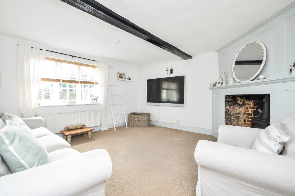 FAMILY ROOM 13' 7" x 10' 5" (4.14m x 3.18m) Measurements to front of chimney breast 13'0" maximum. Door to one side leading to entrance hall, windows to front aspect with radiator under, large built-in storage cupboard with shelving, further low level cupboard, cast iron surround fireplace with tiled inlay, coal effect living flame gas fire (not tested), built-in storage cupboard with range of shelving, beams to ceiling, painted panelling to walls.