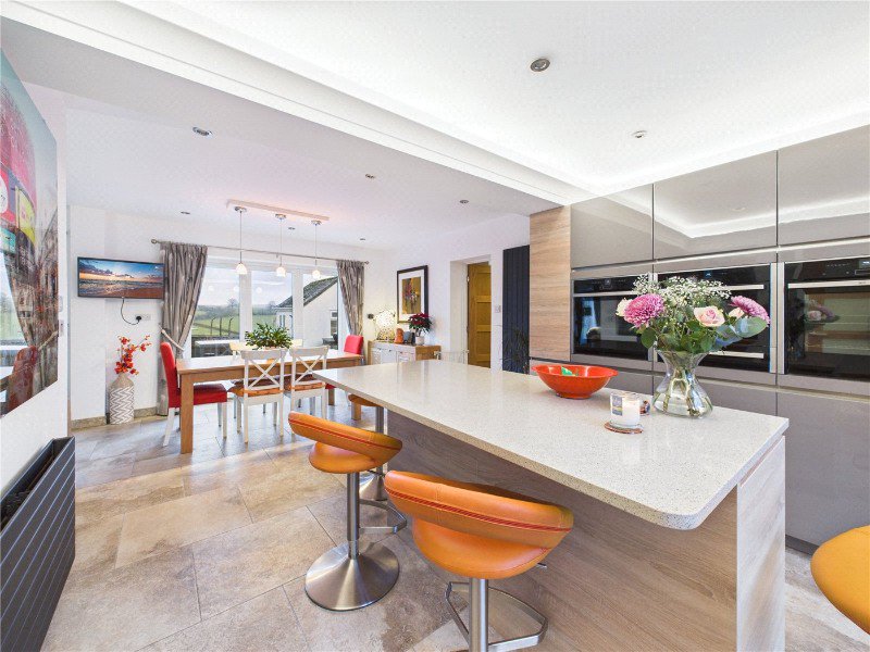 The kitchen is well proportioned and fitted with a range of units and work surfaces, offering ample space for food preparation and storage. The kitchen opens through to a defined dining area, which comfortably accommodates a large dining table and enjoys excellent natural light, making it an ideal family and entertaining space with bi-folding doors opening directly onto the terrace. A utility room provides additional storage and laundry facilities and gives access to a ground floor WC. From the utility room there is internal access into the garage.