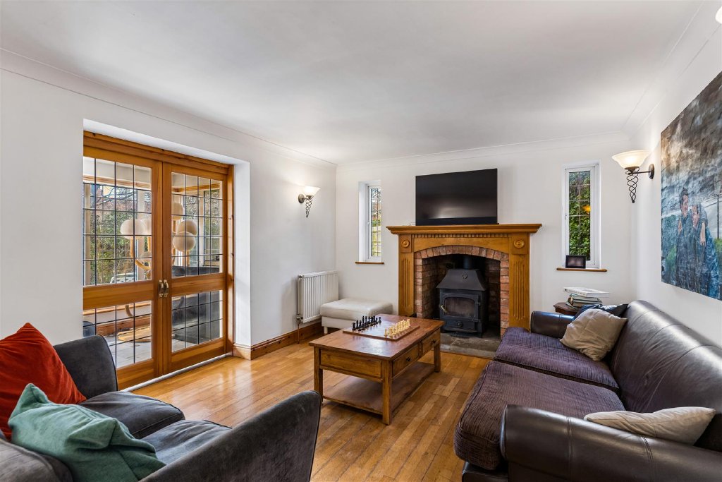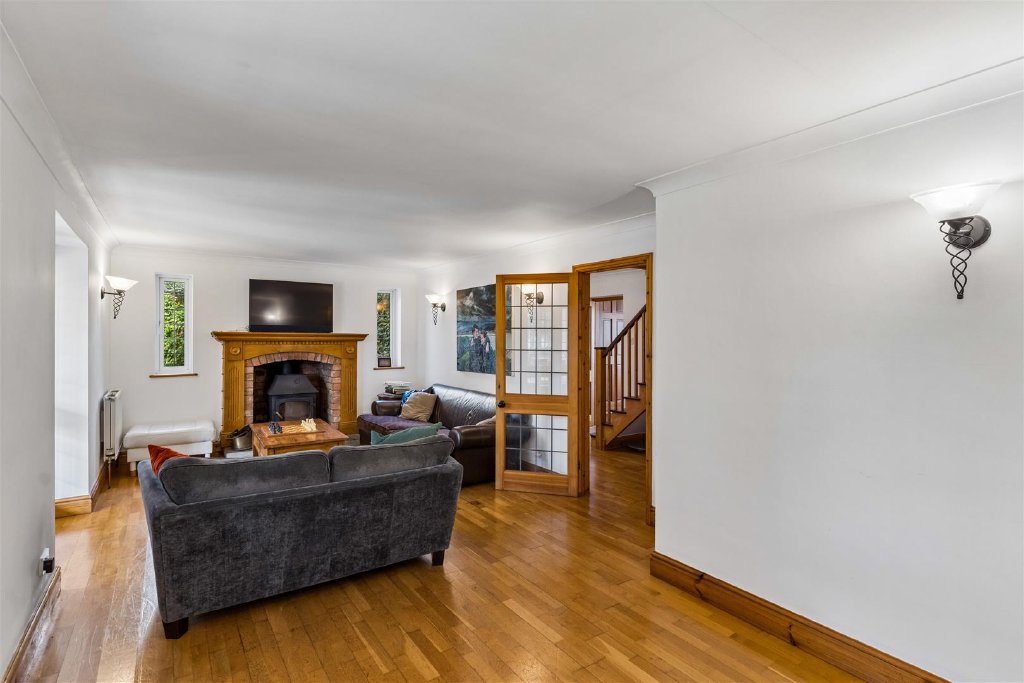 The frontage of the property is dressed with an open pillared porch shielding a new "Endurance" 5 bolt entrance door (10 year warranty). This opens to reception and inner hallways which set the tone for the ground floor, creating an immediate sense of space. The "Junkers" solid hardwood flooring evidenced here extends from the hallway into the sitting room and games rooms. From the hallway which houses a cloakroom, the principal living areas unfold with impressive scale and natural light. The sitting room provides an elegant setting for relaxation having a large fireplace set into a wood surround with an inset wood burning stove. while the games room offers a more intimate everyday space. Accessed from the sitting room is a garden room, flooded with natural light, courtesy of the leaded light doors and windows arranged along the rear elevation. Moving in the direction of the kitchen/family room there is a useful walk in pantry and additional storage cupboards.