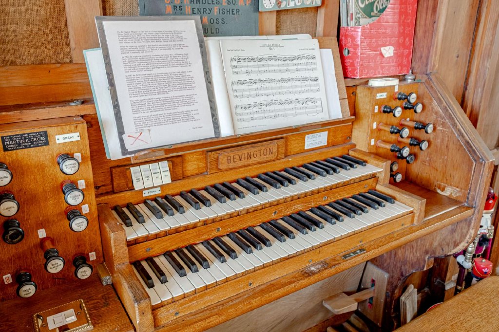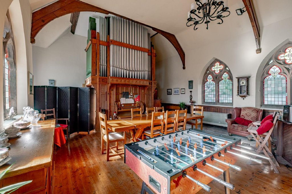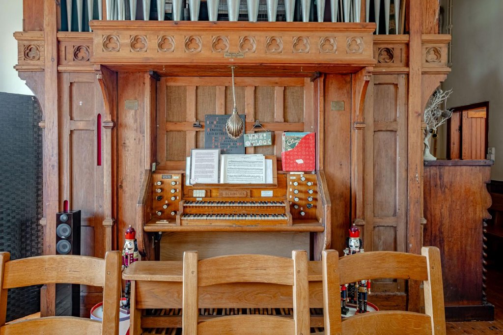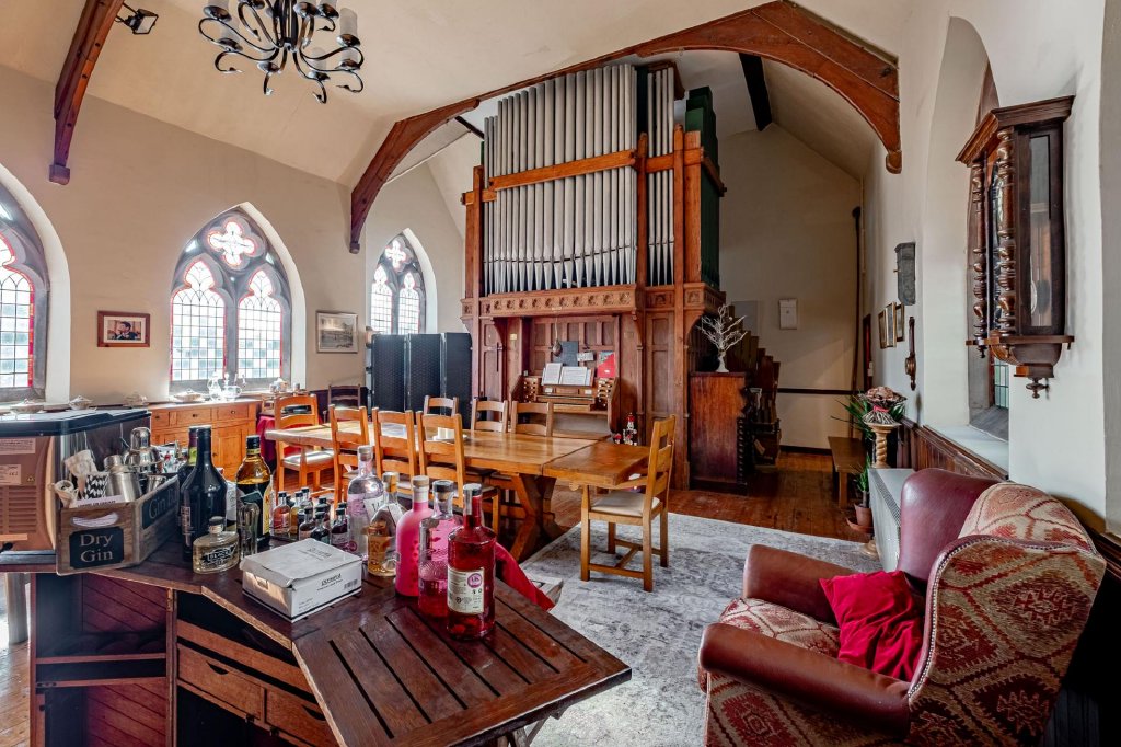 At the heart of the room stands the historic Bevington organ, believed to date from 1876. The instrument provides a stunning focal point and celebrates the building’s heritage, though it could be removed should a buyer wish to repurpose the space.