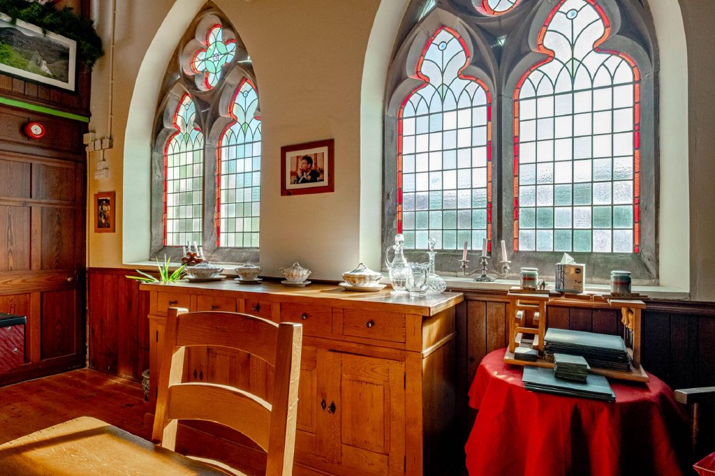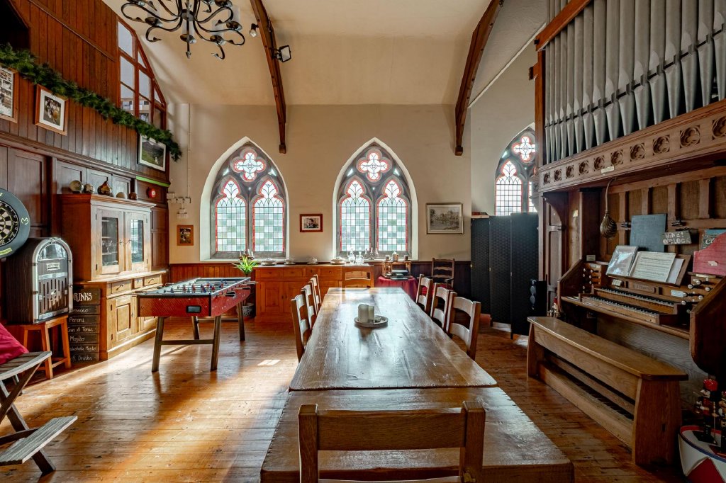 One of the most remarkable features of the property is the former chapel itself. This breathtaking space boasts dramatic double-height ceilings and stained glass windows on both sides, creating a truly atmospheric setting.