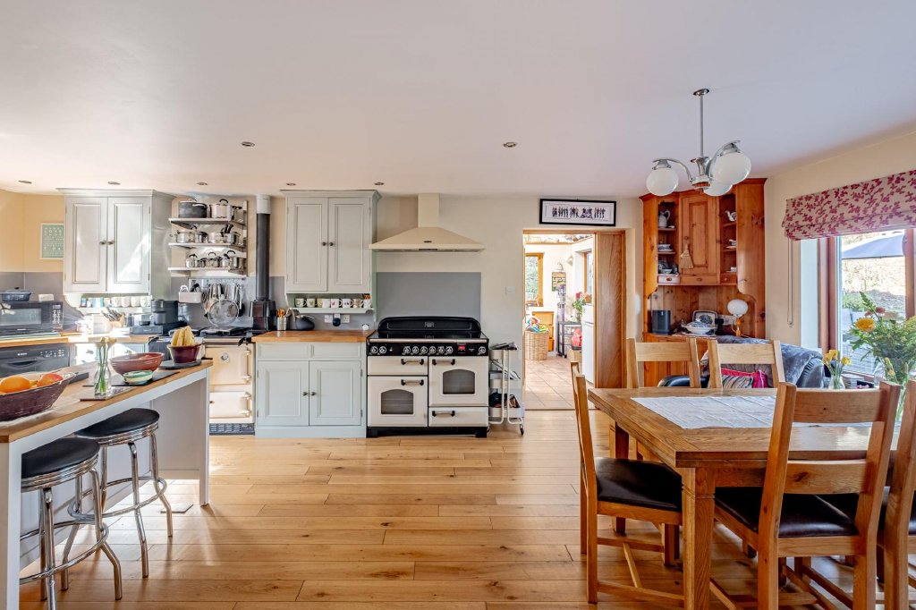 - Impressive Country Kitchen & Dining Space – Traditional shaker kitchen with oak worktops, oil fired Rayburn and Rangemaster cooker, perfect for family living and entertaining.
