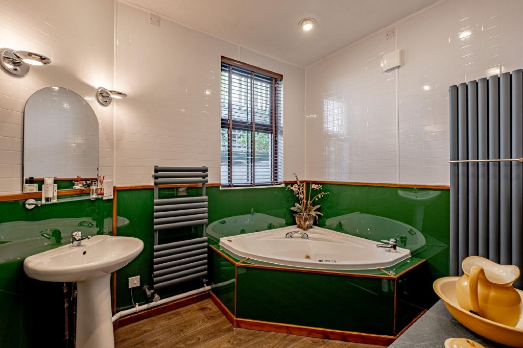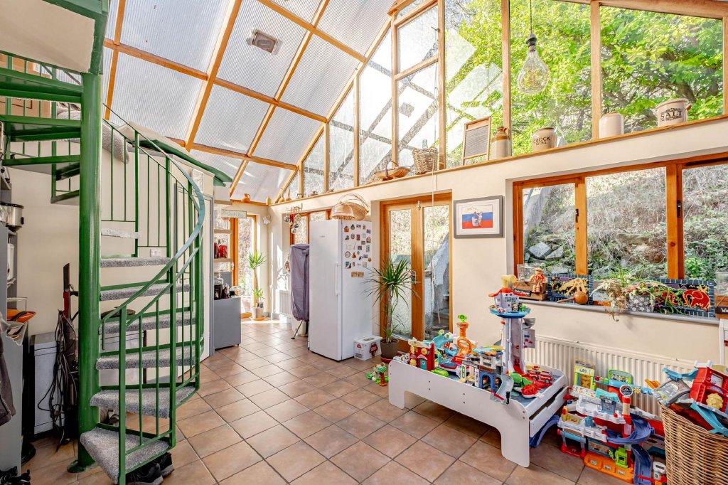 A striking spiral staircase rises from the atrium to a charming ensuite bedroom above. This characterful room enjoys fantastic natural light and features a small kitchenette along with an ensuite shower room, offering excellent flexibility as guest accommodation or a private suite for visiting family.