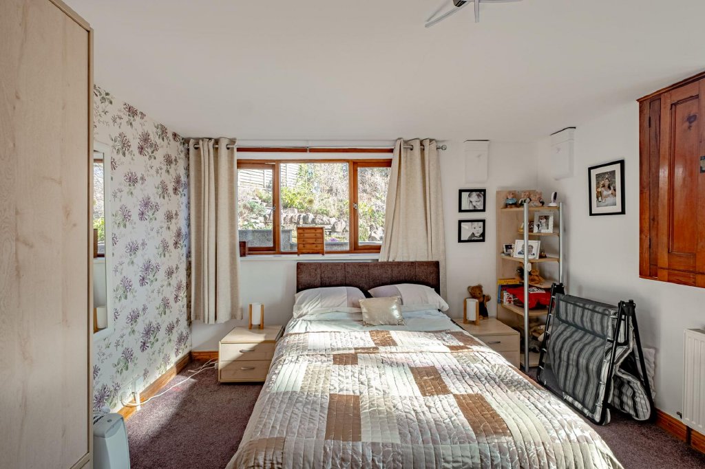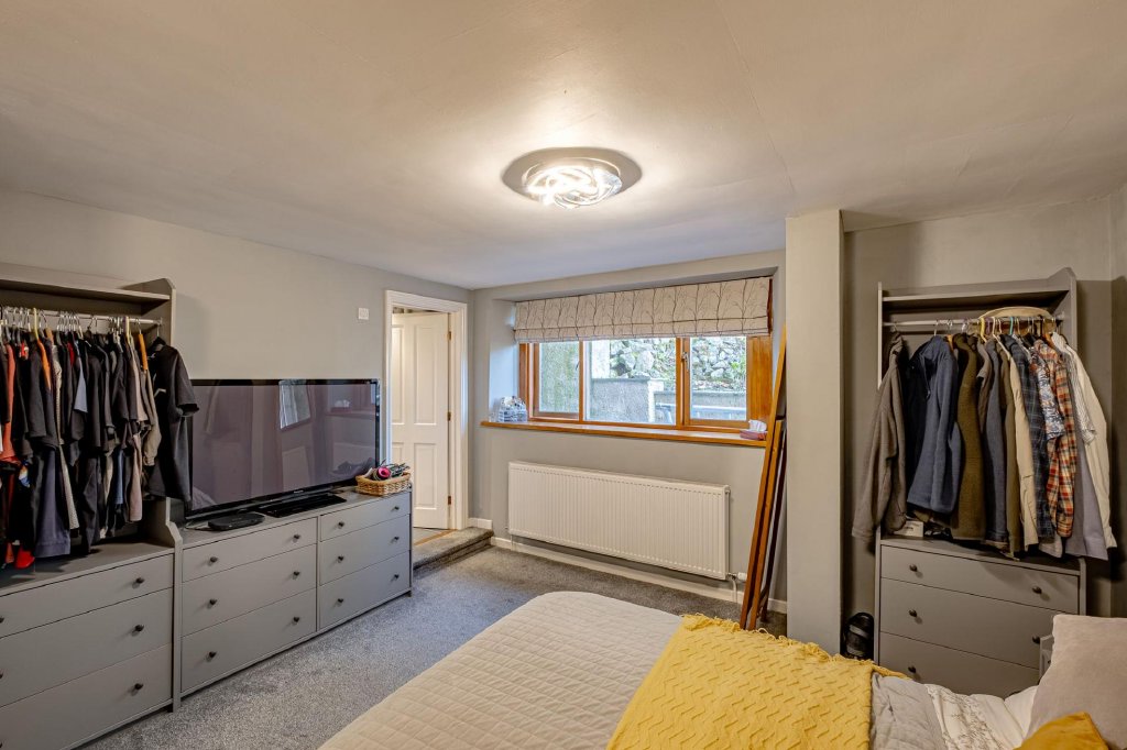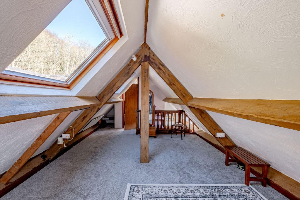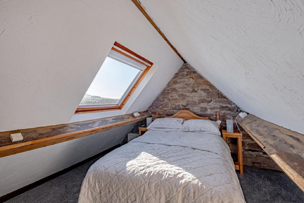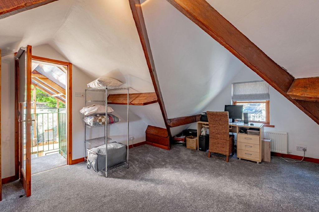 Set within the upper level of the chapel, this bedroom is a particularly characterful space with extensive exposed beams and excellent natural light provided by Velux windows.