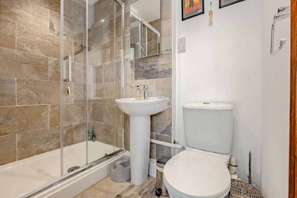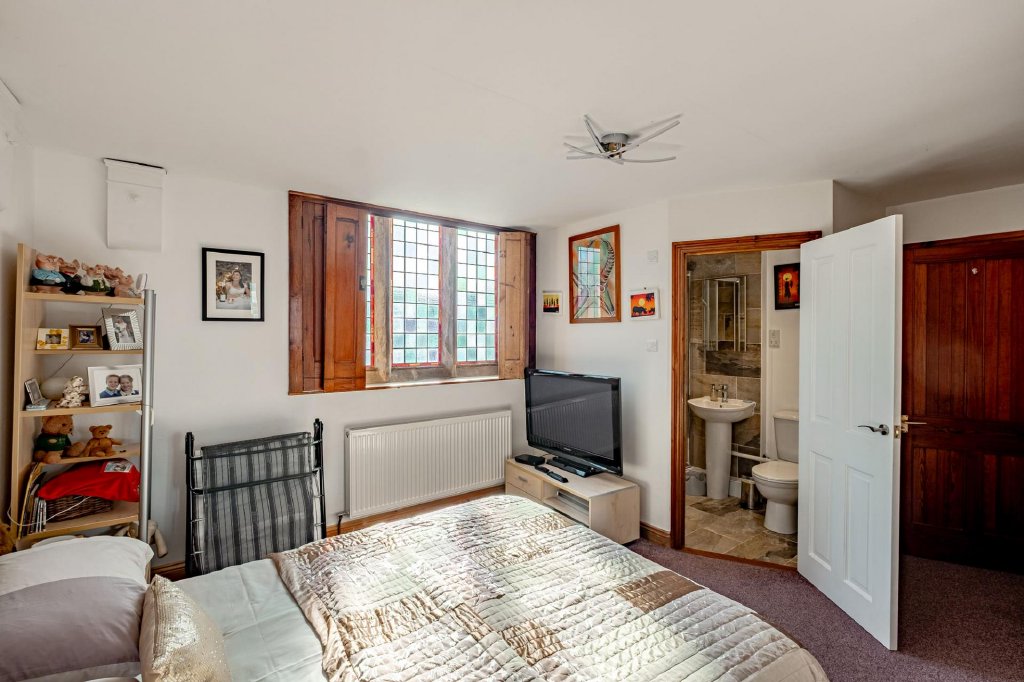 Two double bedrooms are located on this floor, both benefiting from their own ensuite bathrooms. The front room offers a beautifully light space thanks to a set of stained glass windows, complete with working shutters while the back room is much larger, offering the opportunity for plenty of storage.