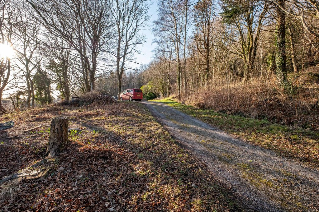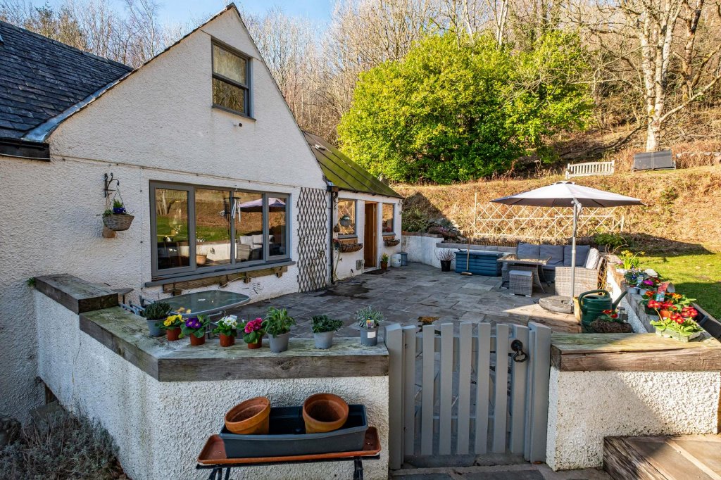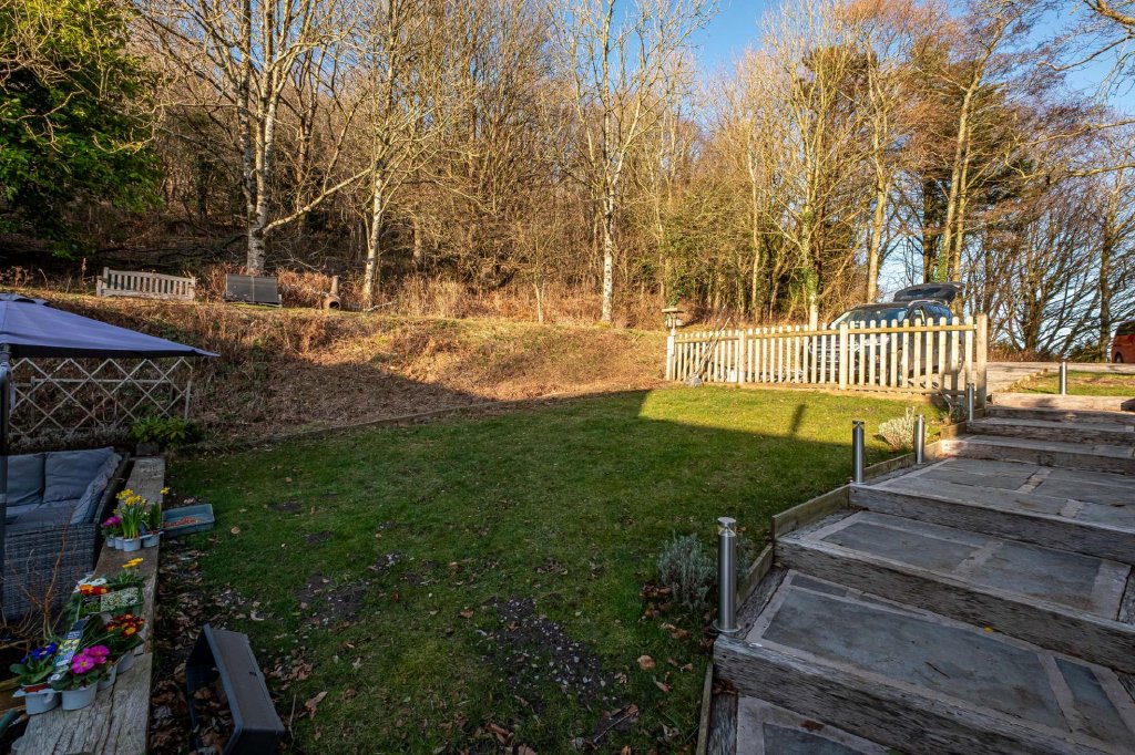 To the rear of the property, an elevated wooden terrace creates an additional secluded seating area and provides access into the woodland beyond.