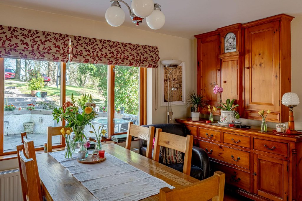 From the kitchen, glazed oak doors lead down two steps into the impressive living room. This room is filled with character, featuring high ceilings, exposed beams and a striking stained glass window which fills the space with coloured light throughout the day.