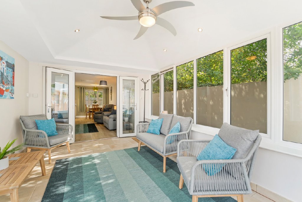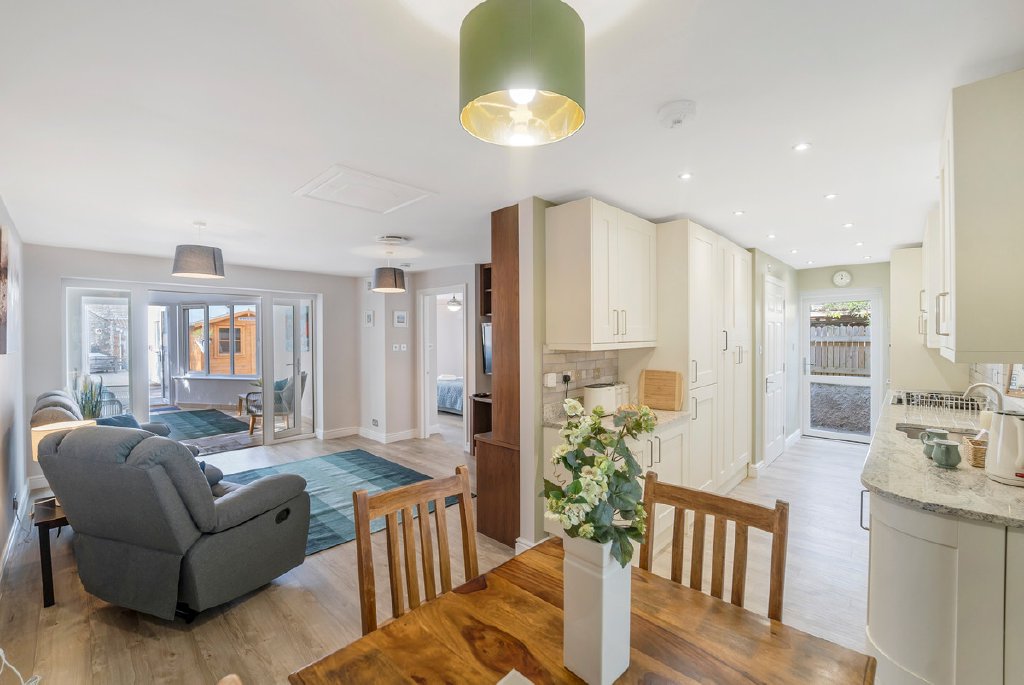 The detached stone annexe, constructed in 2020 to an equally high standard, is approached via a bright garden room featuring an insulated roof, ceiling fan, tiled flooring and underfloor heating, creating an inviting entrance throughout the seasons. From here, the accommodation opens into a spacious open plan living, dining and kitchen area. The kitchen is fully appointed with Neff appliances and granite worktops that mirror those of the main house, resulting in a cohesive and thoughtfully designed interior that feels both stylish and homely.