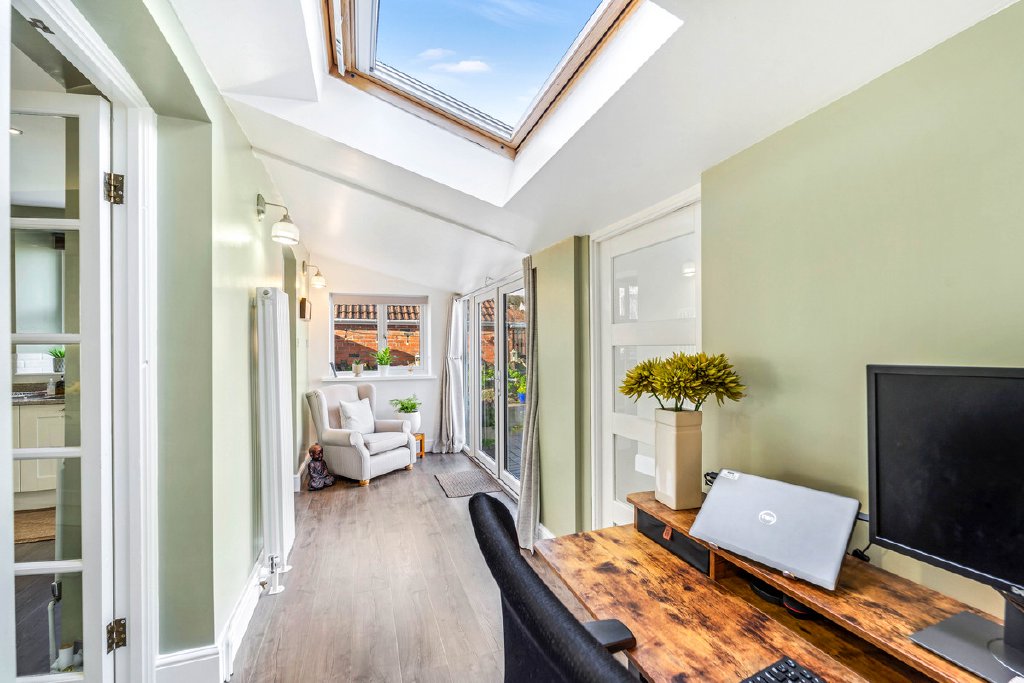 On the first floor, three bedrooms offer comfort and natural light, with the principal bedroom enjoying natural lighting through the Velux and an ensuite shower room. The second double bedroom is bright and the third bedroom is currently used as a dressing room with bespoke fitted storage adding flexibility to suit a variety of needs. A stylish family bathroom with a freestanding bath and refined fixtures completes the main house’s sleeping accommodation.