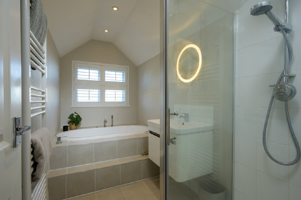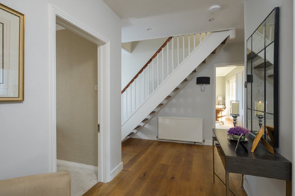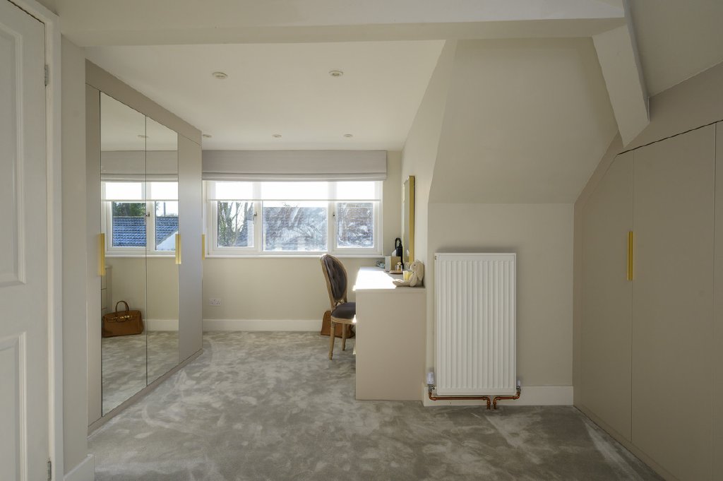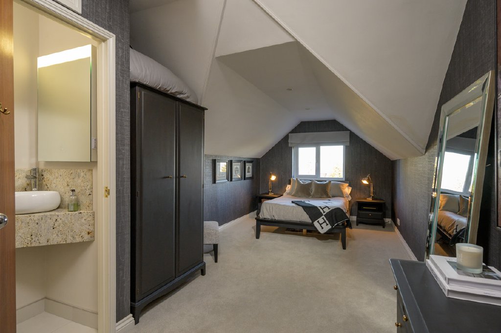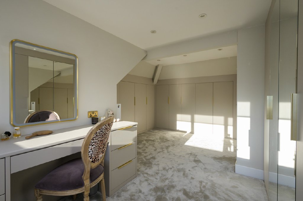 The main staircase leads to the first floor, where the principal bedroom suite is particularly impressive, featuring Sharps fitted wardrobes and a dual-aspect layout that once again captures the far-reaching views. This floor also offers a beautifully designed bathroom with a sunken bath and separate shower, creating a relaxing sanctuary. The fourth bedroom is currently arranged as a luxurious dressing room, complete with fully fitted Sharps wardrobes and a bespoke vanity area. A stylish cloakroom completes the accommodation.