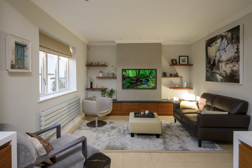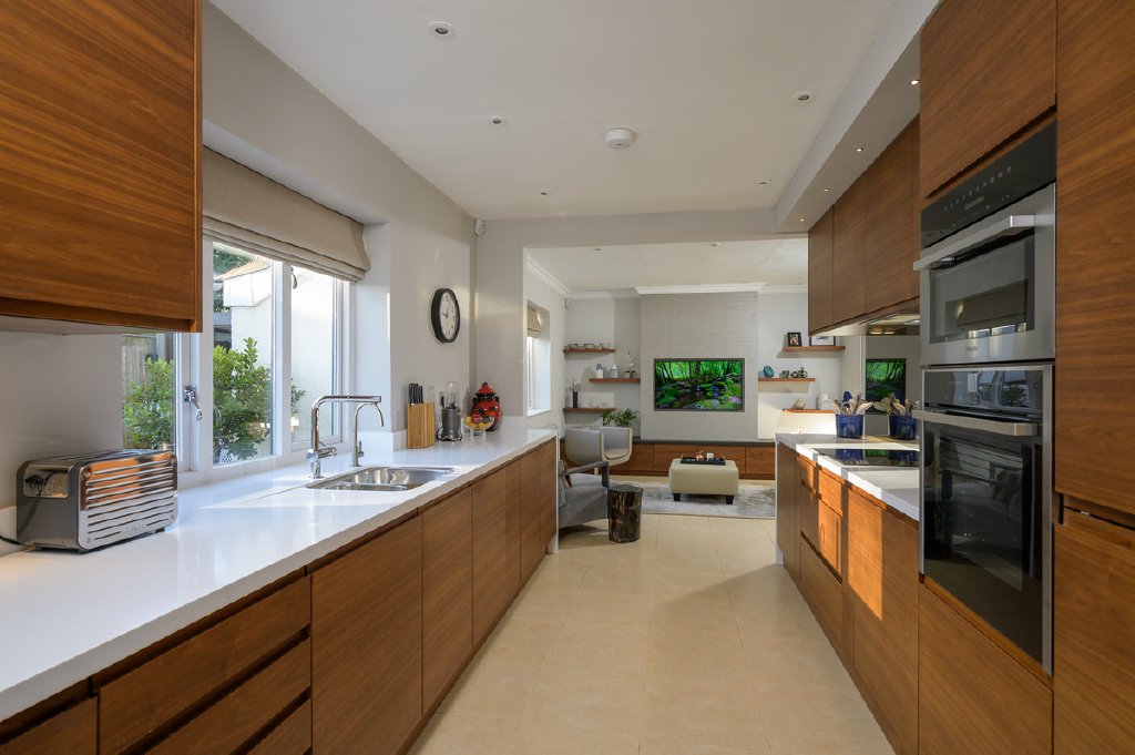 At the heart of the home lies the impressive open-plan kitchen/family room, finished with bespoke walnut cabinetry and Corian worktops, creating a sleek yet luxurious aesthetic. A comprehensive range of high-end integrated appliances includes a Miele fridge and freezer, combi microwave oven, double oven and grill, induction hob with extractor, dishwasher, twin sinks with mixer taps, and a three-stage filtered water tap. Also on this level is a generous double bedroom with fitted wardrobes and a stylish family bathroom.