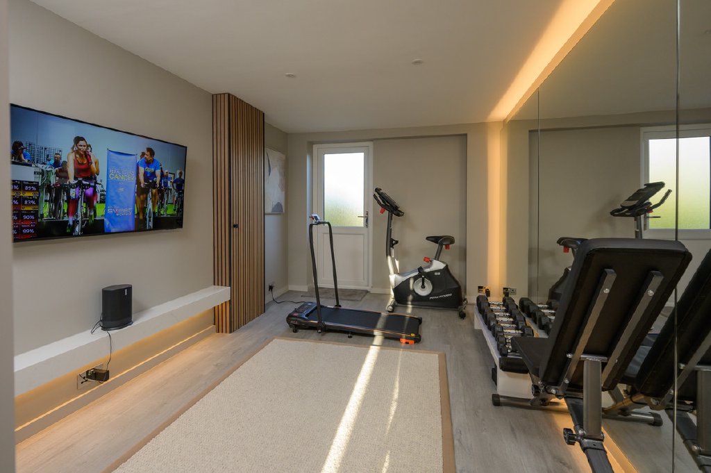 A well-appointed utility room with bespoke cabinetry and full plumbing leads through to the gym, which has been thoughtfully designed with underfloor heating, fitted storage with integrated freezer, wall mirrors, TV point, and a useful external door to the front of the property.