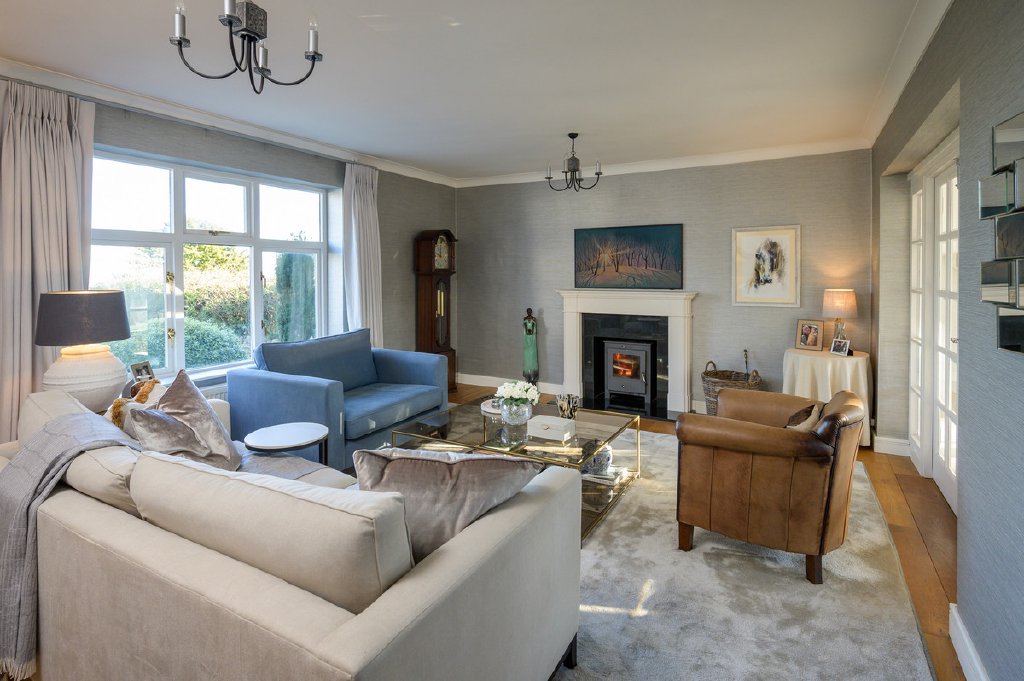 - Large sitting room with wood burner, oak flooring, dining room with full height glazed windows
