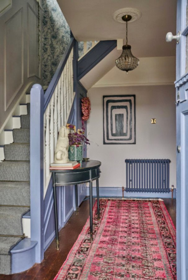 On approach, the original covered storm porch opens via a solid oak door into a welcoming entrance hall with stripped floorboards, an under-stair cupboard, and the original staircase rising to the upper floors.