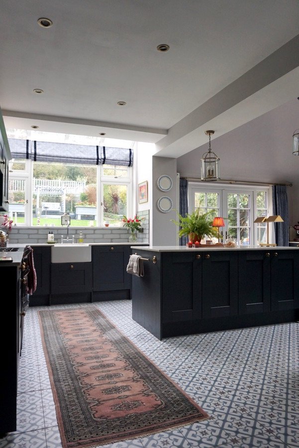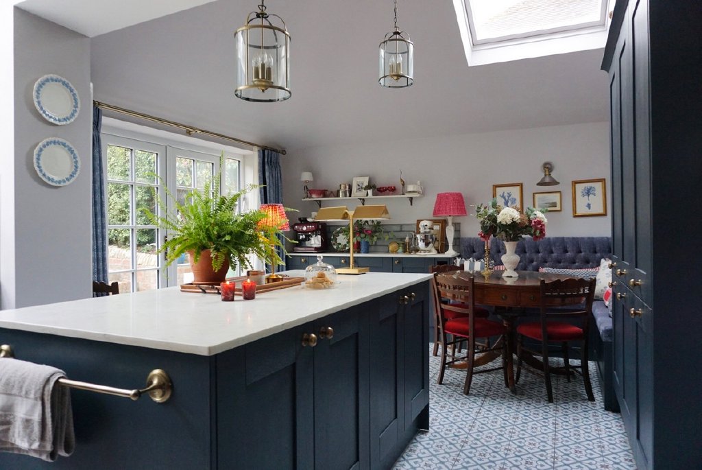 The extended kitchen/family room forms the heart of the home, a light-filled space with large windows and skylights, there are ample wall and floor units finished with Quartz worktops, a matching central island, and integrated appliances including a dishwasher and fridge/freezer, plus space for a Range cooker. A Belfast sink, stylish tiling, and designer lighting complement a bespoke banquette dining area with further navy cabinetry and plush velvet seating, blending comfort with sophistication. Adjacent lies a spacious utility/boot room featuring a pet shower and external access, alongside a cloakroom and inner hall leading to the garden.