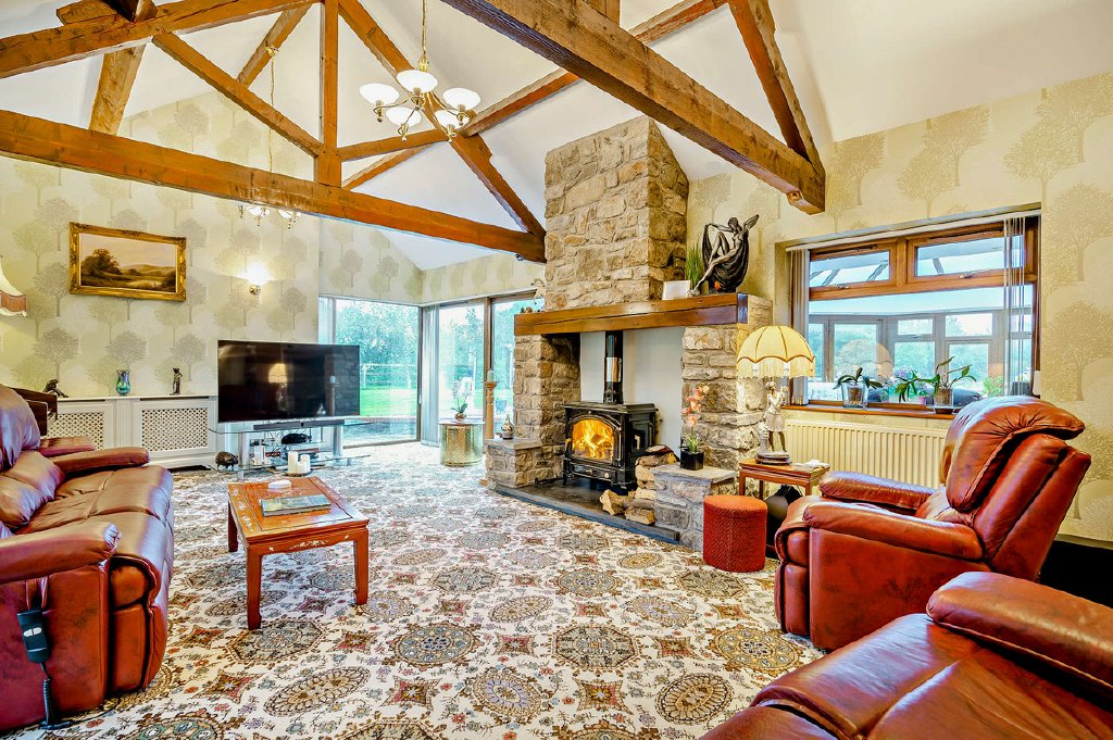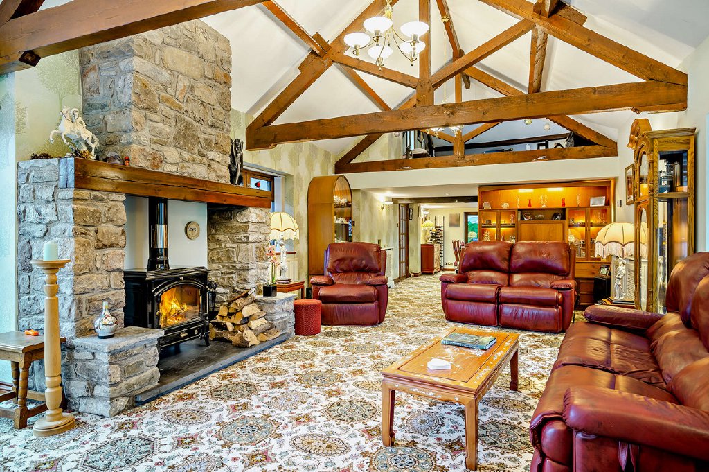 This masterpiece features a grand 45ft sitting room, complete with a charming log burner, vaulted ceilings adorned with exposed beams, and windows that frame the picturesque countryside. The perfect spot to relax and unwind, it's an ideal retreat for both cozy evenings and grand gatherings.