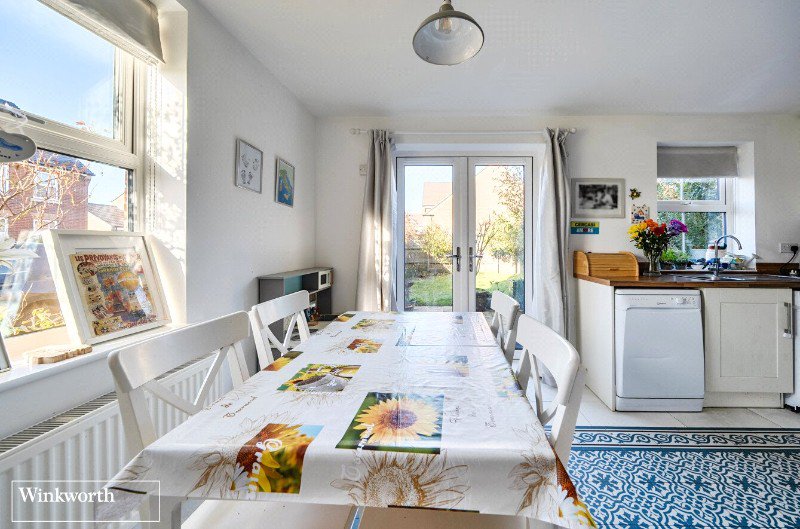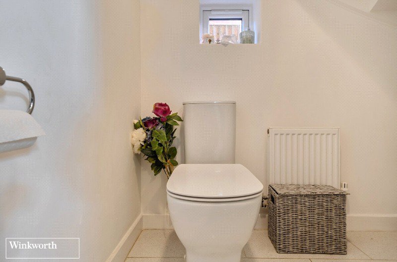 The house has a wide central hallway with the downstairs toilet at the end, to the left of the stairs. To the right is the twin aspect living room that has a bay window overlooking a green space to the side of the house.